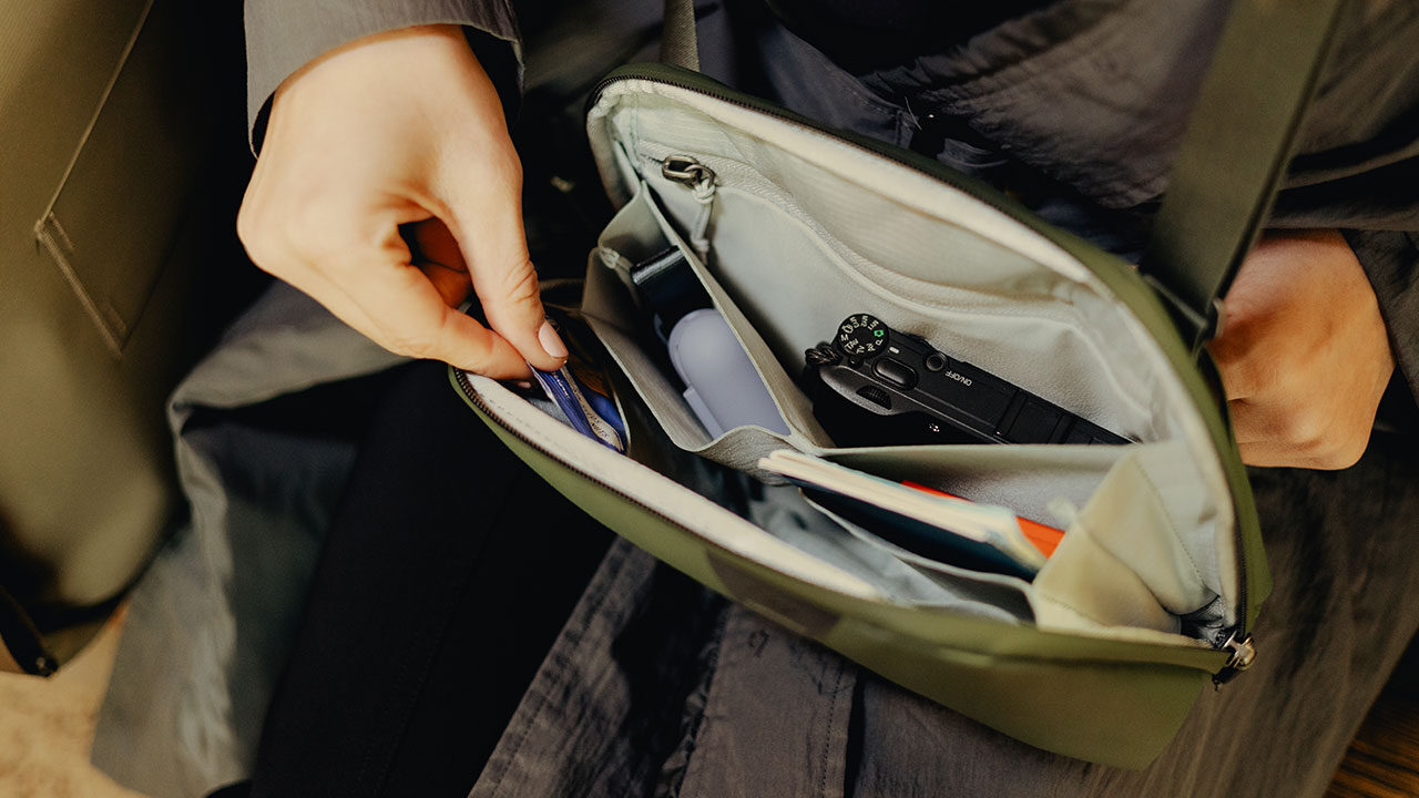 This sling really shines on the inside, which is one reason I like the concept so much. Peak Design borrowed from its popular Tech Pouch, one of my favourite travel organizers, and added origami-style dividers that split the main compartment into four neat sections. Smaller slots hold items such as battery banks or point-and-shoot cameras, while the larger channels can fit a paperback or a compact gimbal. There is also a zippered pocket along the back interior wall with a key leash and a hidden tracker pocket tucked inside. These are useful touches for anyone focused on keeping valuables secure in busy airports or transit stations, especially in places such as Paris or London. Three additional pockets on the front wall round things out, along with a slot for a pen or stylus.
