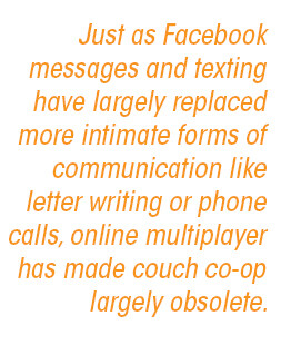 Playing co-op games didn’t create or define my relationships with friends and family, but it did offer something that is inherently more social than the remote, Bluetooth-enabled distance of modern co-op and multiplayer modes. The current landscape of cooperative play ties in with a larger trend, enabled by the proliferation of Internet connections, that sees different types of social interactions shifting to the digital sphere. Just as Facebook messages and texting have largely replaced more intimate forms of communication like letter writing or phone calls, online multiplayer has made couch co-op largely obsolete.