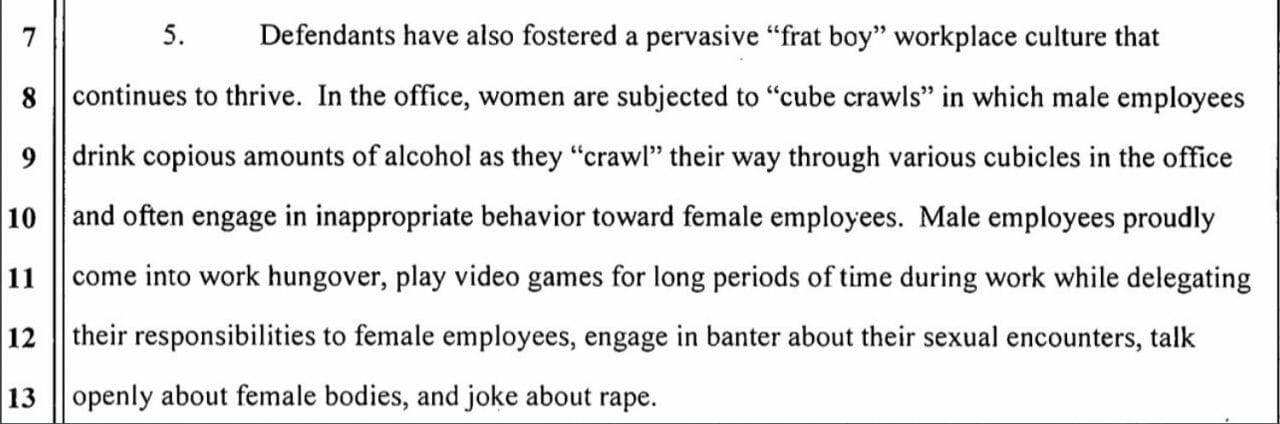 Some of the most heinous claims in the lawsuit are surrounding a female employee who committed suicide on a business trip after her male supervisor brought butt plugs and lubricant with him on the trip. On top of that, its alleged that male employees go unpunished for casual jokes about rape, boasting about sexual encounters and commenting on female employees in a sexual manner.