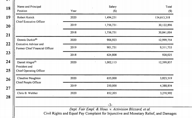 The lawsuit also notes that Activision Blizzard “is only about 20% women. Its top leadership is also exclusively male and white. the CEO and President roles are now—and have always been—held by white men. Very few women ever reach the top roles at the company. The women who do reach higher roles earn less salary, incentive pay and total compensation than their male peers, as evidenced in the Defendant’s own records.”