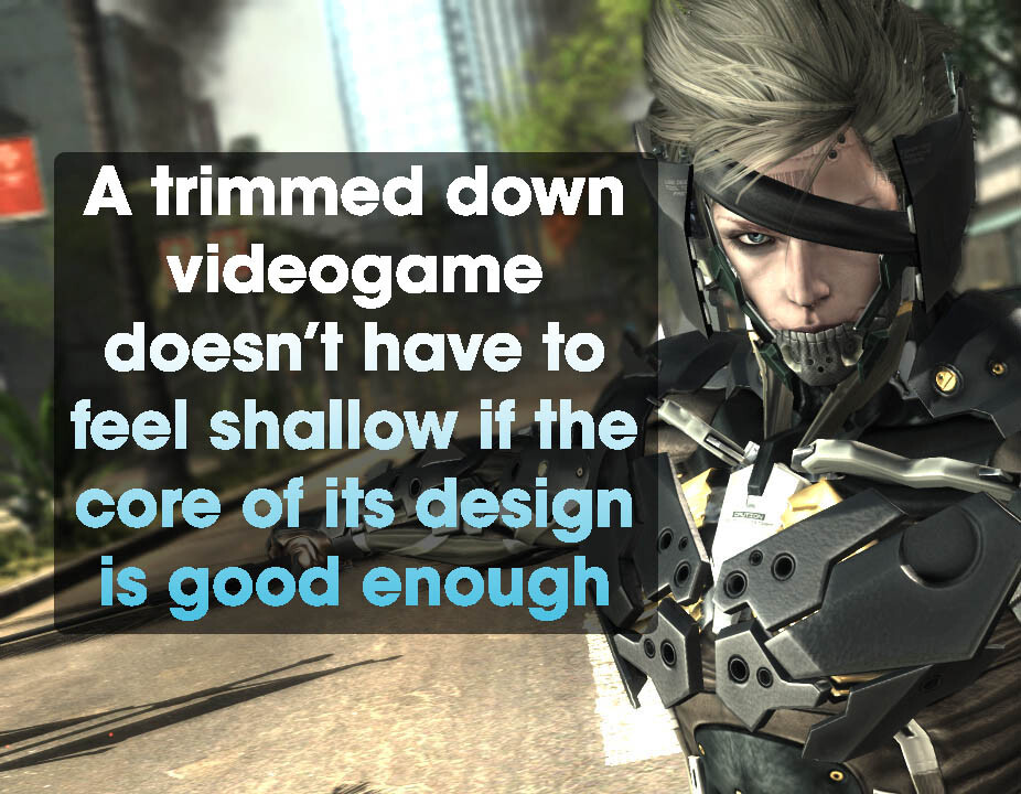 Some titles benefit from interspersing action set pieces with quieter moments of exploration (what would Uncharted be without its lovely platforming sequences?) while others would do well to note why Revengeance is such a joy to play through. A trimmed-down videogame doesn’t have to feel shallow if the core of its design is good enough. Though I never solved puzzles or navigated tricky environments in Metal Gear Rising, the strength of its swordplay was more than enough to make it stand out.