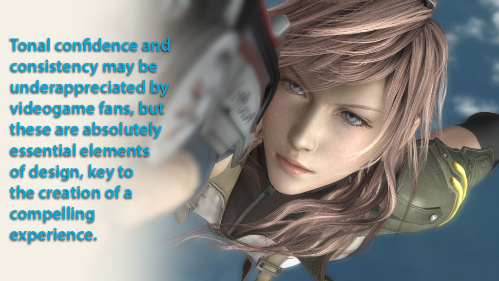 Tonal confidence and consistency may be underappreciated by videogame fans, but these are absolutely essential elements of design, key to the creation of a compelling experience. There are so many moving parts in game development that it seems almost miraculous that not every game turns out as uneven as FFXIII. Even with a top-notch art director doing their best, a breakdown in communication between their department and, say, the animation team can lead to an unintended result. I can’t presume to be familiar enough with the inner workings of the typical videogame development studio to suggest a way to address this kind of problem. But I do think the fact that some of the most consistently designed videogames have been created by either small teams (Hotline Miami, Superbrothers: Sword & Sworcery EP, Fez) or under the guidance of confident game directors (Bioshock and Ken Levine or Metal Gear Solid and Hideo Kojima). An unwillingness to compromise—and having the leadership structure in place to fully execute on a good idea—seem necessary for an ambitious developer. A less focused development process seems like it can only lead to uneven games that fail to make the most of their concepts.