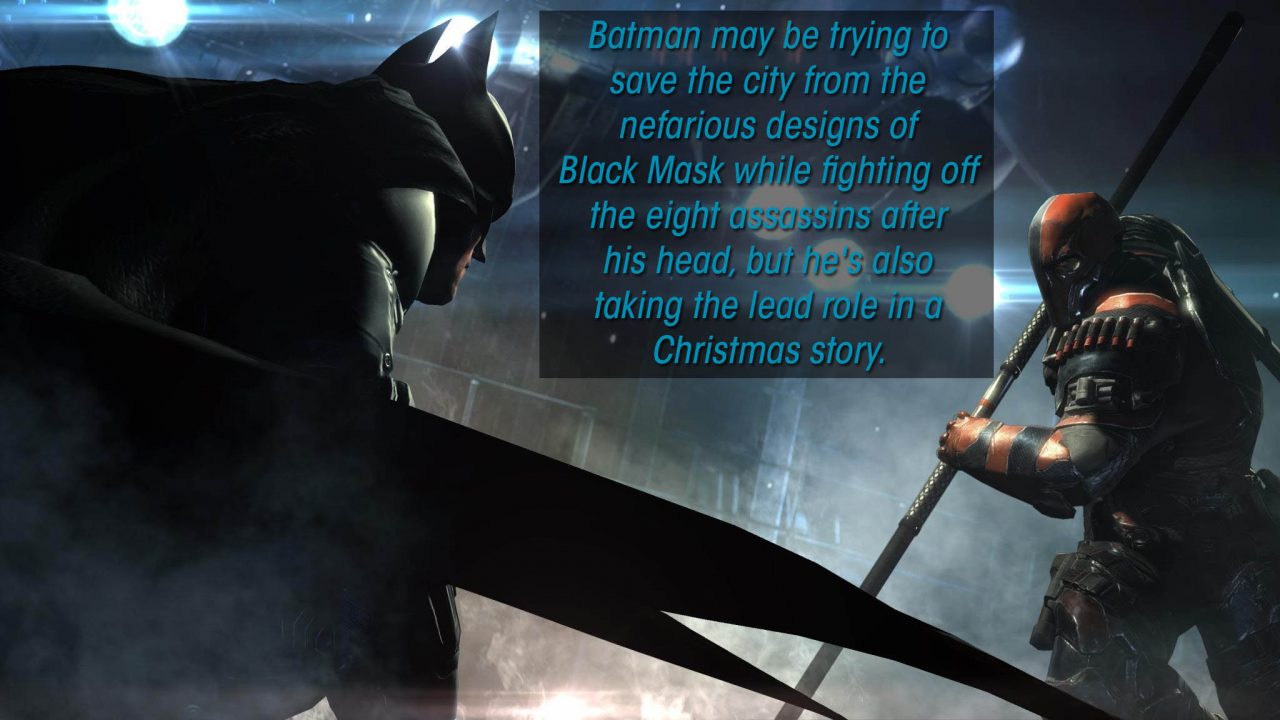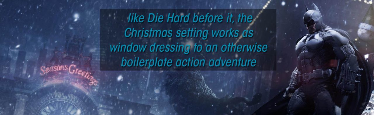 Batman: Arkham Origins is, like Die Hard, about a lone hero out to save the day by taking on overwhelming odds . . . during the holidays. This is unusual for videogames even though it seems like nearly everything else about Die Hard, from its “boss fight” henchmen to its one person versus an army premise, seems to have found a place in the medium. This is a good thing because when judged strictly on its own merits, Arkham Origins isn’t an incredibly memorable game. While it’s still an awful lot of fun to cruise around beating up thugs and grappling across rooftops, much of Origins is a rehash of the formula established in its predecessor, Batman: Arkham City. This was the primary criticism leveled at the latest Batman game upon its release. It feels like more of the same; it isn’t innovative enough to have the same kind of impact on the medium that the two previous Arkham games had. All of that is fair enough, yet I’m willing to bet that Arkham Origins will remain in players’ minds far longer than it otherwise would have. And that’s due to one simple reason: its holiday setting.