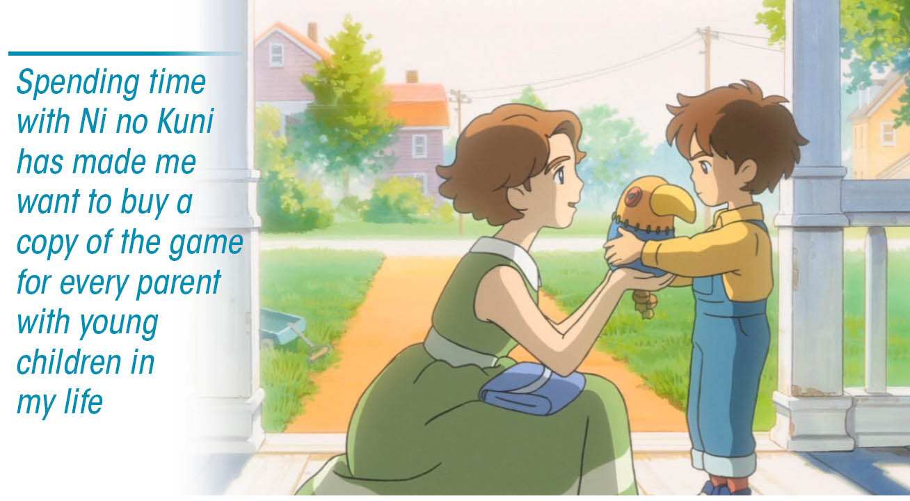 I’ve been playing Level-5 and Studio Ghibli’s Ni no Kuni: Wrath of the White Witch lately. Aside from finding the incredible visuals and refreshingly straightforward gameplay enjoyable, spending time with Ni no Kuni has made me want to buy a copy of the game for every parent with young children in my life. There aren’t many games with the type of charm that it has, let alone the willingness to engage with the complicated subject matter that is so often missing from children’s stories.