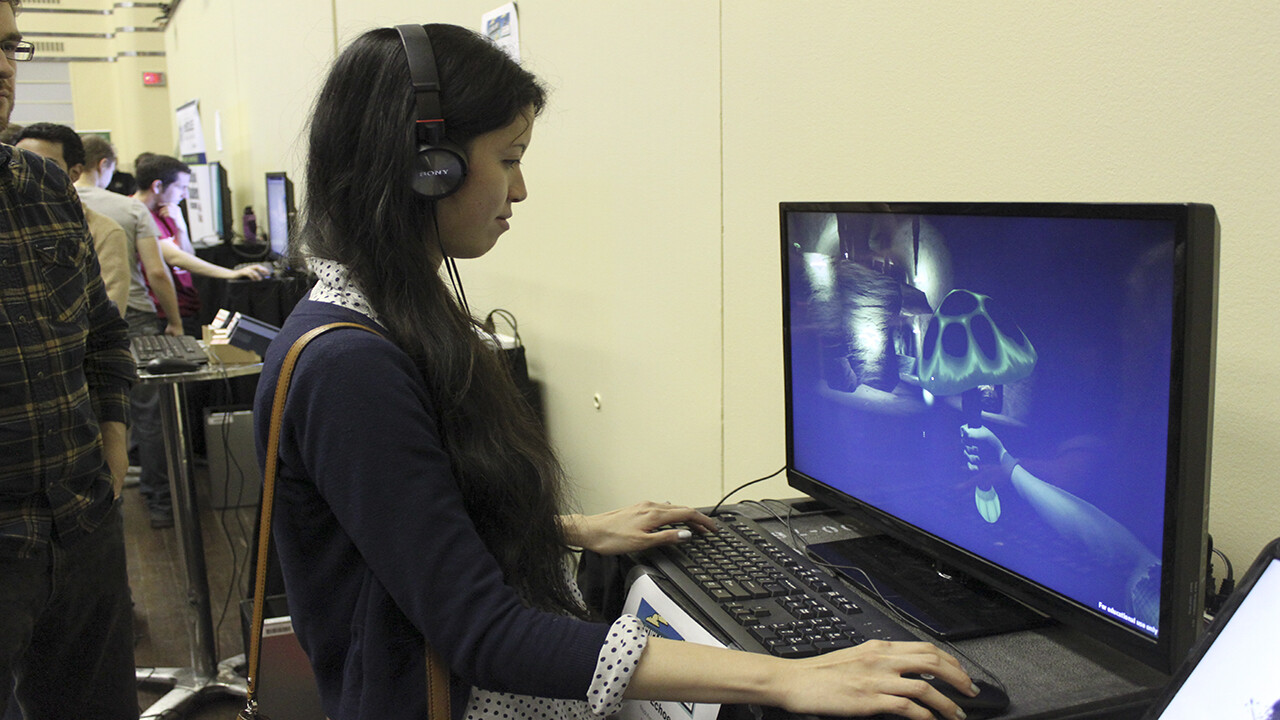 One student with that outlook was Mirza Beig, a fourth year University of Ontario Institute of Technology student. He was there to show a game he made himself, Retroid 3D. Taking inspiration from wall runner flash and music games, Beig created an experience that didn’t need a controller. Players steer a spaceship through a tight corridor, blasting whatever gets in their way. All of this is done to the beat of a song of the players choosing. Working alone came with challenges. “There were a lot of times I wanted to ask my friends for help,” says Beig, trying to talk over the blaring music from his game. “If I didn’t pull myself out, no one will.” Some last minute changes came to the play style. Originally, the game was designed for a keyboard, but before the event he added Leap Motion, a sensor for the motion controls.