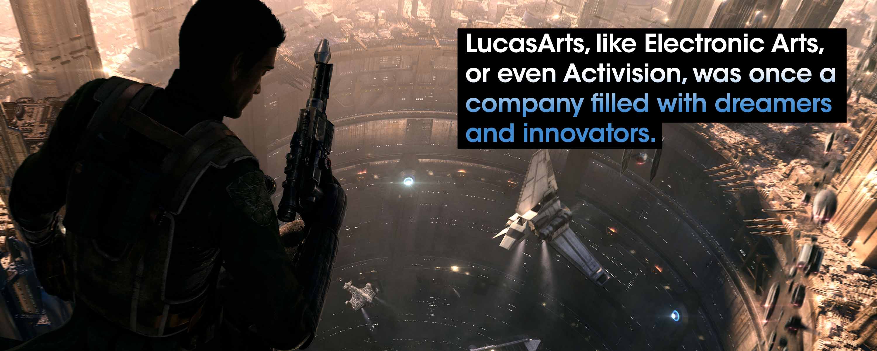 This makes me sad on a great number of levels. Not many people will remember this, but LucasArts, like Electronic Arts, or even Activision, was once a company filled with dreamers and innovators. The first two games ever released by the company—then under the name Lucas Film Games, published by Epyx—were about futuristic vehicular sports and rescuing downed space pilots respectively. There wasn’t a light saber or star destroyer in sight. The next few years would see an explosion of creativity from the company as titles like Koronis Rift, Maniac Mansion and of course, The Secret of Monkey Island all showed the world that the level of imagination at George’s facilities wasn’t just confined to Star Wars. Of course, when the spotlight did turn to Star Wars, it still took a surprising twist with some of the most complex and satisfying simulated space combat available in the form of Star Wars: X-Wing that finally allowed the players themselves to switch deflectors to “double front” and understand what that actually meant.