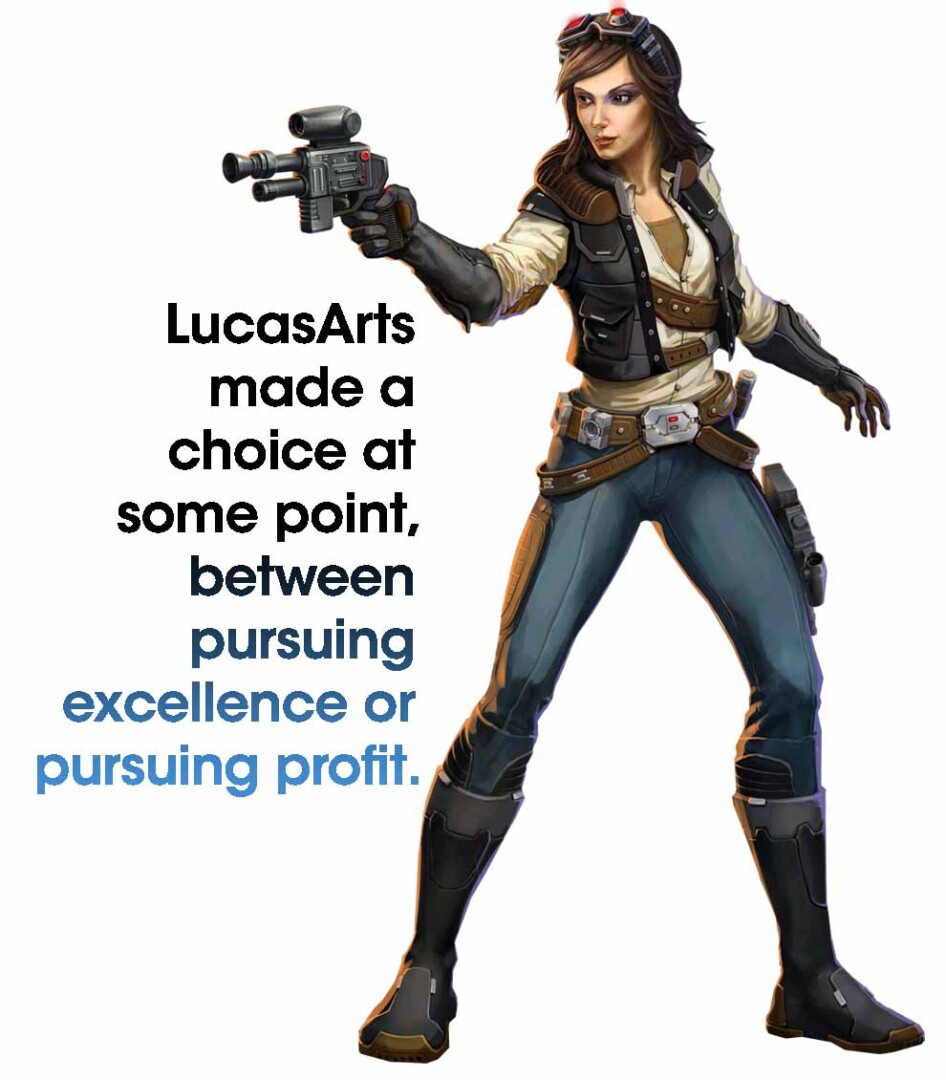 Unfortunately the good times couldn’t last, and once LucasArts got a taste of licensed success, they fell victim to the same problem that had hit both Activision and Electronic Arts earlier; the lure of bigger money pushed out the innovation. The same company that gave us compelling adventures like The Dig or even entrusted their cherished property to BioWare to produce Knights of the Old Republic started chasing after demographic research and larger market share. It meant the end of the more experimental, memorable phase of the company and the start of the floundering as their recent titles, namely The Force Unleashed II and the Star Wars: The Old Republic MMO have shown. Now, with a recent string of middling titles that have failed to be huge hits and a new parent company that has their own game development woes to fret over—just ask Warren Spector how well Junction Point Studios is doing right now—it’s no wonder that production on big budget, AAA games has ground to a halt.