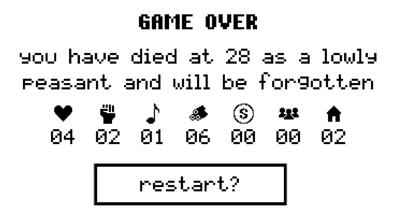 Achieving the end goal is harder than it seems. I myself have only lived to be about 27 years old – mind you, I haven’t seen any other players getting any higher than 40 years, and the starting age is 12. Angering the monarchy, fighting knights, ransacking inns, and converting loyalist without proper preparation and rest probably played a part in it too.
