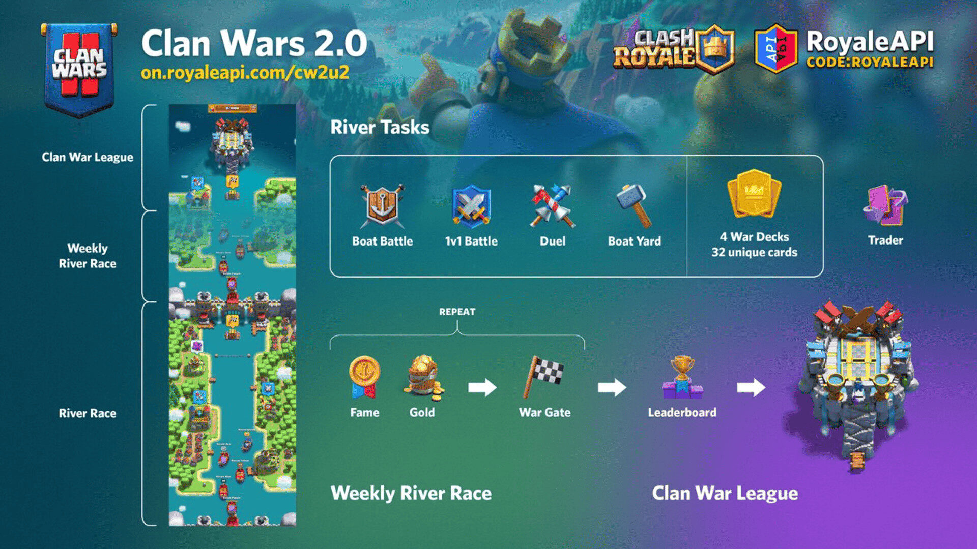 A key highlight is the River Race, where clans battle along a virtual river map. Each clan has a boat that can be upgraded for better defence and faster progress. You’ll earn points by completing battles, which pushes your boat forward and brings you closer to finishing first.