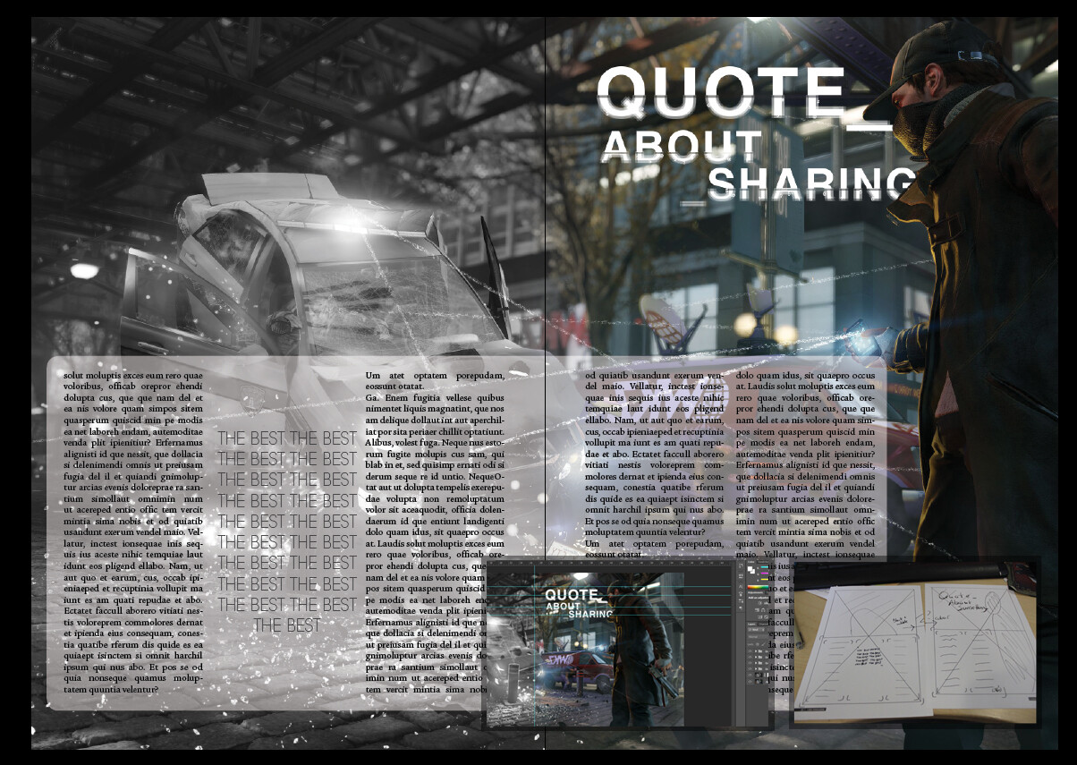 Also pictured are a sample mock-up where the article was originally sketched out, and the PhotoShop workspace where the background graphic of the page was designed.