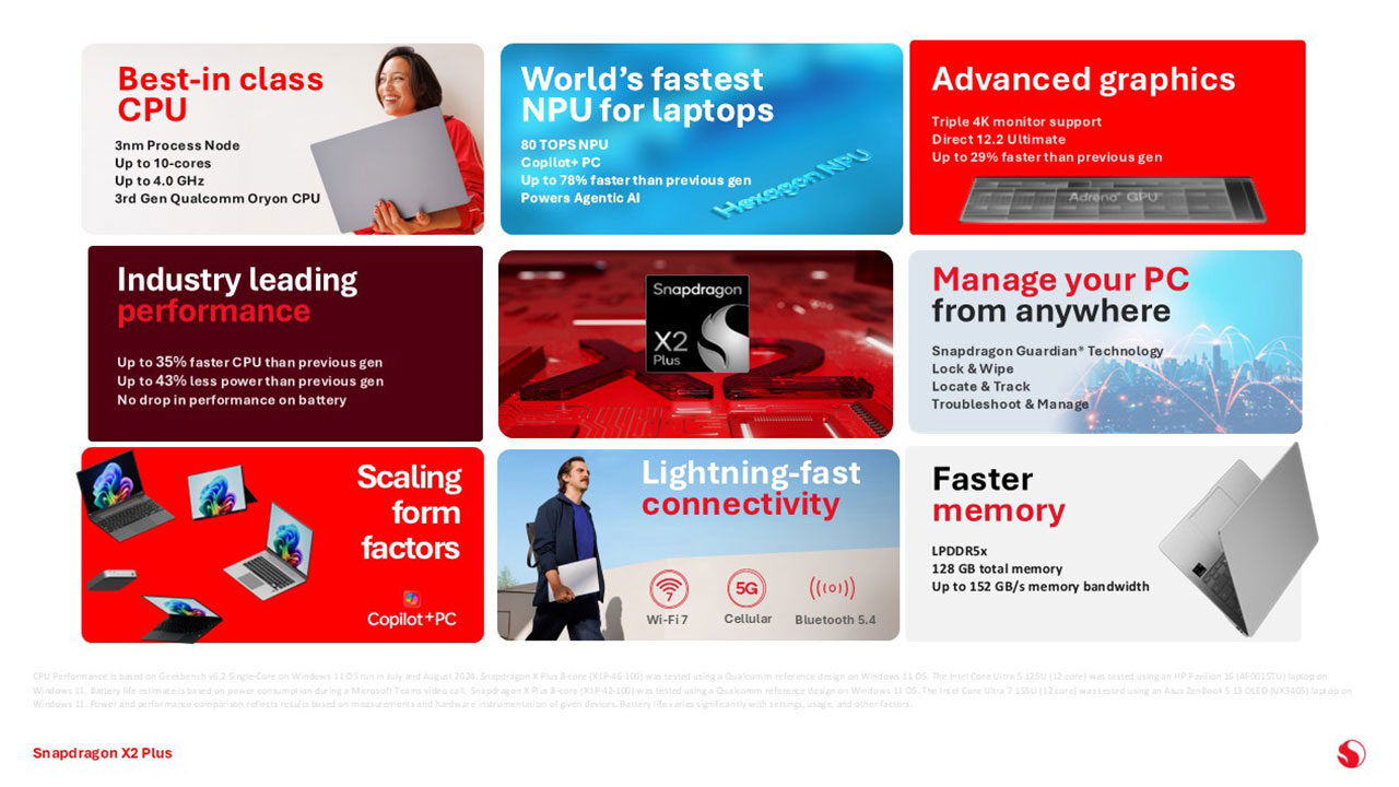 Beyond artificial intelligence, the X2 Plus places a strong emphasis on efficiency and connectivity. The chip integrates an Adreno GPU to deliver improved graphics performance, supporting up to three external 4K displays or a single 5K screen. For mobile professionals, the platform includes Wi-Fi 7 and 5G capabilities, providing fast and reliable connections whether working from a coffee shop or a transit hub.