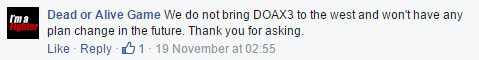 Fans asked Koei Tecmo on the official Dead or Alive Facebook page if they could expect to see the game come to the west and were met with ““We do not bring DOAX3 to the west and won’t have any plan change in the future.”