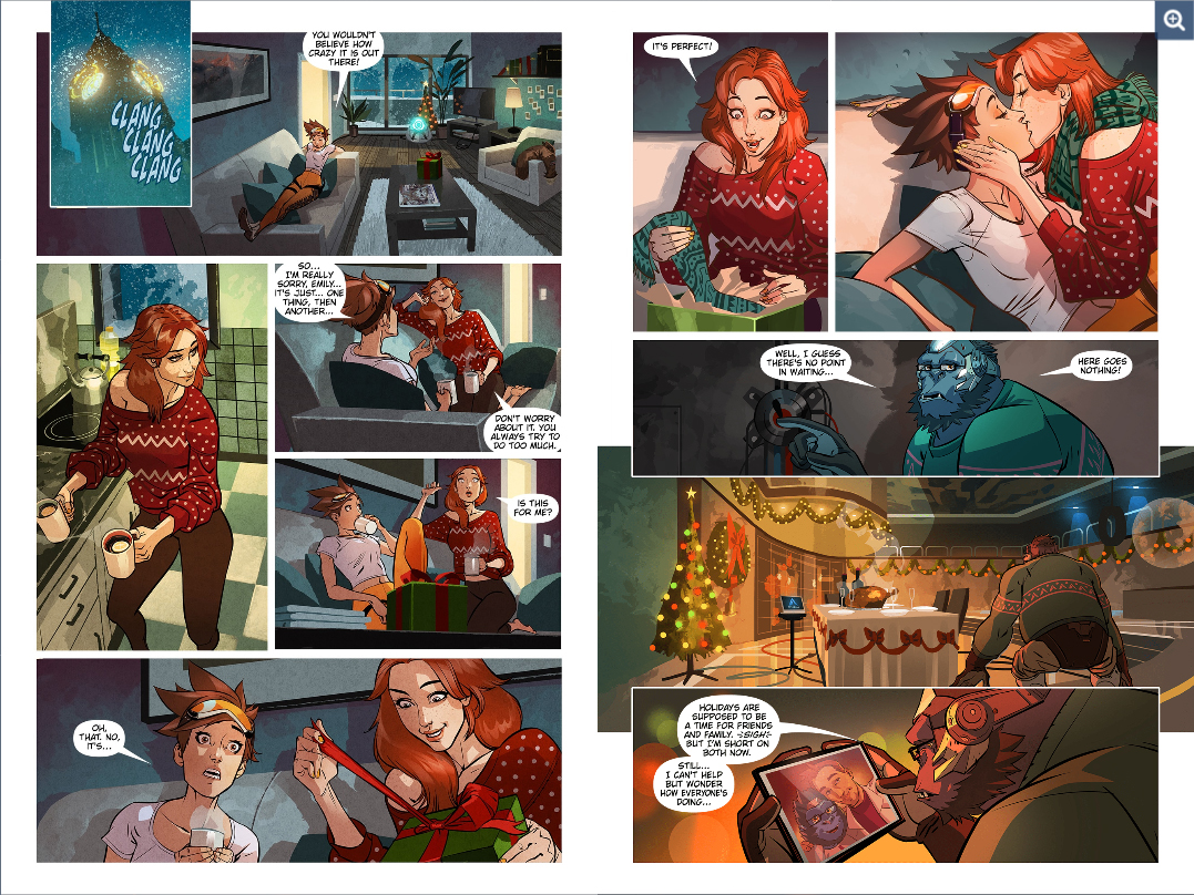 Fans of the game have sometimes paired Tracer with her mortal enemy, Widowmaker but it looks like that wishful thinking is crushed as the hero is taken. The newest comic in the Overwatch franchise titled, “Reflections” went live today on their website. The 12-page Christmas comic features the speedster Tracer as she runs through the city to find a gift for a girl who lives with her (and isn’t on the Overwatch team) named Emily. Towards the end of the comic, the two share a passionate kiss. The apparent couple then have Christmas dinner with Winston while other characters in Overwatch are shown celebrating the holiday in various ways.