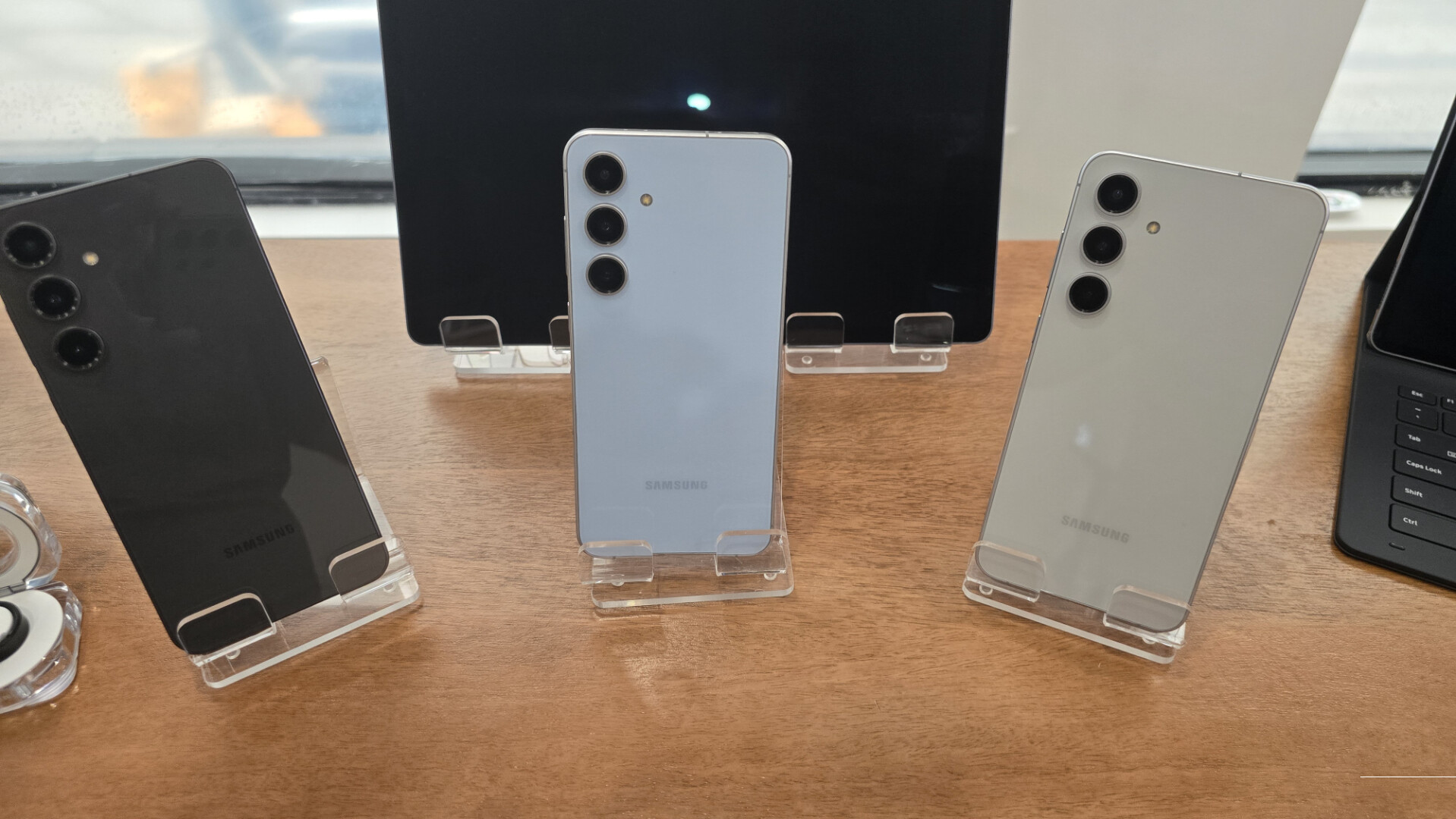 Next, we saw the Samsung Galaxy S24 FE, the first of Samsung’s phones built specifically for Galaxy AI, optimized for Samsung’s Artificial Intelligence. It comes in five colours: Graphite, Grey, Blue, Mint, and Yellow. The camera setup is similar to the Galaxy S24+, with three lenses. The 50MP wide and 12MP ultrawide lenses are found on the S24+, but the telephoto and front-facing lenses drop from 10MP to 8MP and 12MP to 10MP, respectively.