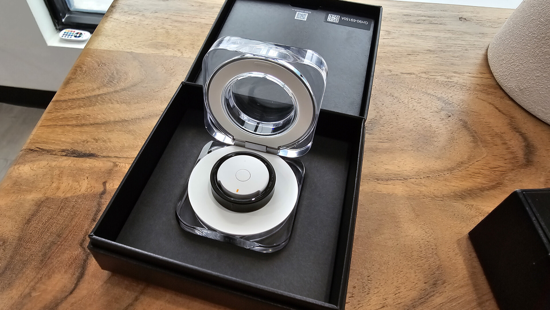The Samsung Galaxy Ring charges in a rechargeable ring case with a column, around which the ring rests as it charges. An LED ring around the column lights up to confirm charging and can also indicate the remaining battery life for the case. If you lose your ring, pressing a button on the case activates LEDs on the ring that flash to help you locate it.
