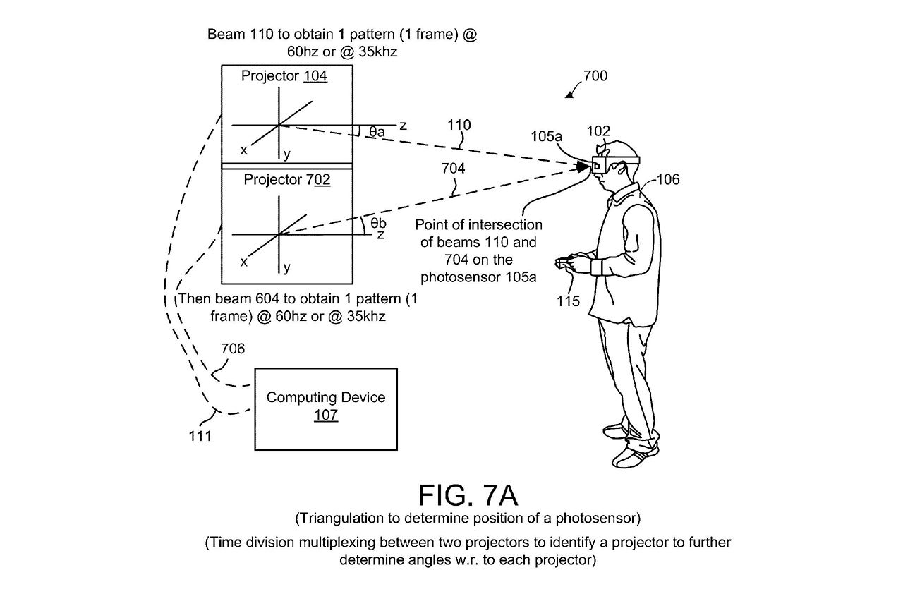 While it may sound confusing, it is basically outlining a similar device to what the Vive utilises — a beam projector that determines the player’s position in the play-space based on light and mirrors (similar to the way sonar works). For those who do not know difference between an external system such as then HTC Vive, compared to what PSVR has built in; it all comes down to immersion. At present, the PSVR employs a built-in system that relies on light from the headset and the PlayStation camera to place the player in the virtual world, offering little mobility for the player.