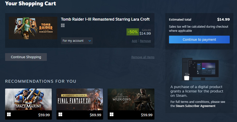 On Steam this has manifested when you open your shopping cart, right before you hit the “continue to payment” button. Now a notice pops up on the bottom right-hand corner saying “A purchase of a digital product grants a license for the product on Steam.”