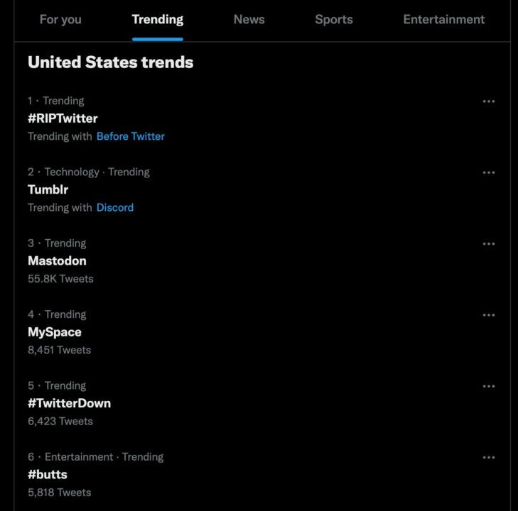 There are Tweets from users that blatantly suggest switching platforms from the Twitter, to older platforms such as Tumblr, to the point of what appears to be the official Tumblr account posting “hold up like 12 new ppl joined. we’re working on it. give it a sec :)” in regards to the influx of users. It’s worth noting Tumblr was trending right below #RIPTwitter, on Twitter’ Now Trending’ section late last evening.