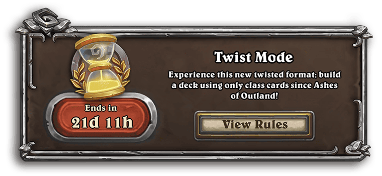 Twist is a Hearthstone ladder Mode with regularly rotating seasons, each with a twist on the rules! Twist formats can include curated card pools and special rulesets. These formats are sure to bring back some of your favorites, but in a new setting with a new meta to crack!