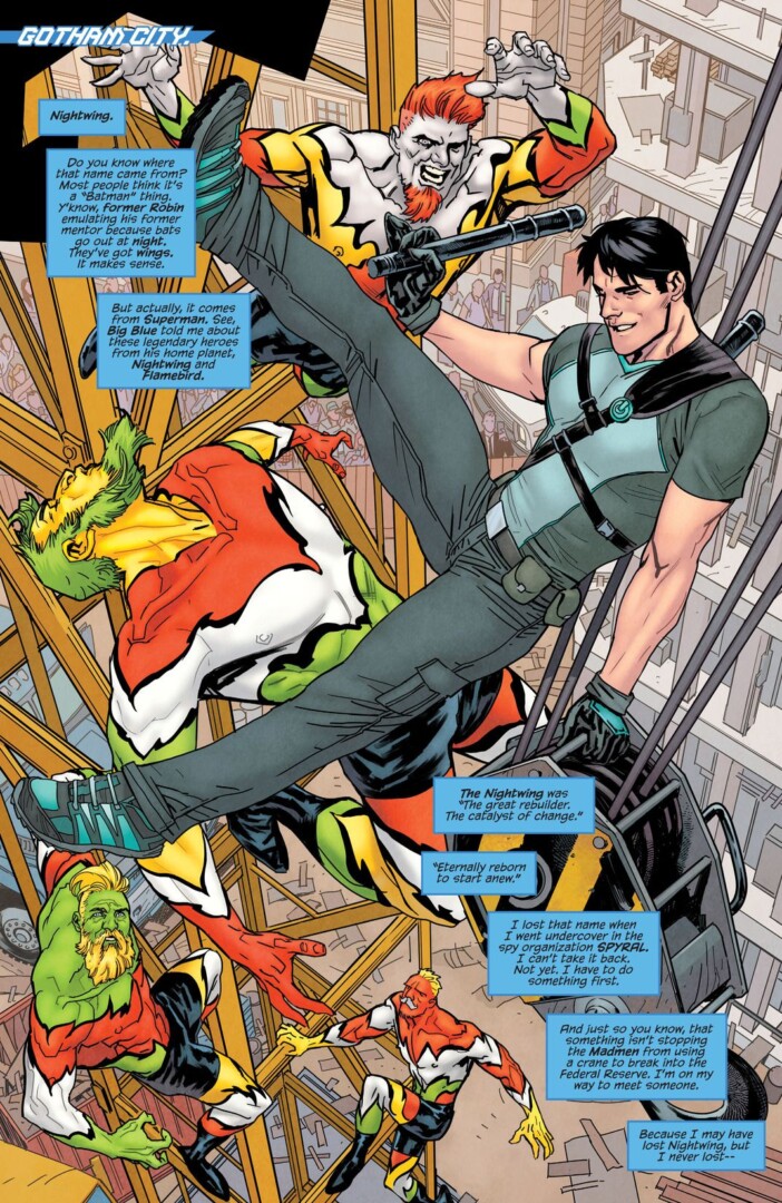 What we get is a lot of intimate moments with some questionably meme-heavy writing (the dialogue is mostly fine, but the jokes are cheap shots or fall flat). I’m talking Dick and Damien at the arcade, hanging out and talking shop about what it means to be super, with some added Batman baggage to boot. Another classic Nightwing coming of age trope is revisited here, like the fact that he doesn’t really belong in Gotham even though he was raised there; his purpose is to move where he’s needed. All of these themes I’m enjoying as they unfold, and are a nice contrast to Batman’s reserved, static nature.