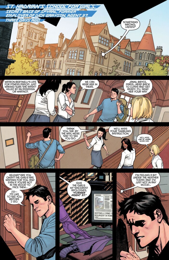 While the first issue does a great job of explaining the story so far, the Rebirth format is definitely not as intuitive as the New 52. Here we have an established and respected Nightwing returning to Gotham City, and all of the baggage that comes with that. The status of his identity, the fact that he was briefly Batman, and even a spy named Agent 37, are all laid bare, but barely touched upon. So if you’re looking to go in completely fresh after a long hiatus, you probably need to do some light reading.