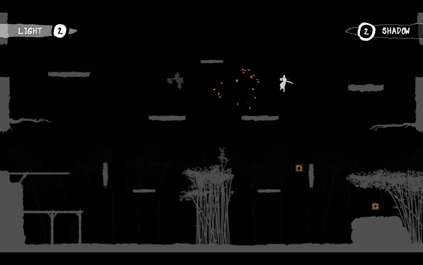 Often, I would be unable to leap to a nearby wall to reach a higher vantage, or double-jump with enough strength to get up before the enemy flag vanished. While I never felt like killing someone was glitchy or unfair, with clashing and dashing feeling quick and rewarding, simply moving around could become an exercise in frustration. The five levels are largely the same, save for different platform layout and light patterns (affected by your performance in the match to aid you with better light or shadow).