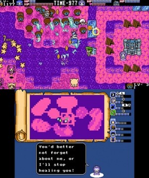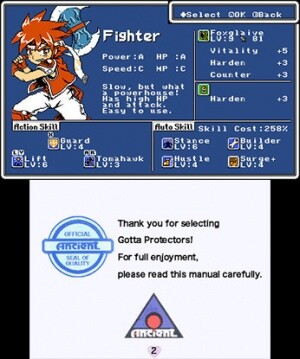 I mentioned before that Gotta Protectors has some prestigious contributors, chief among them Yuzo Koshiro, legendary composer of Streets of Rage and Etrian Odyssey. Koshiro’s musical score is one of the game’s greatest delights, and diehard audiophiles (that’s me) can purchase an alternate FM version of the soundtrack as DLC for $7.99 USD. The development team’s cadre of talented musicians also includes industry veterans like Shinji Hosoe (Nine Hours, Nine Persons, Nine Doors), Hiroshi Kawaguchi (Space Harrier), and Hisayoshi Ogura (The Ninja Warriors), to name a few. The best way to make a game that feels transplanted from the 80s, as it turns out, is to bring together developers who made their names in the 80s. Go figure! Rounding out this Faux-micom delight is a virtual manual on the bottom screen, complete with a useless memo page, and at least one honest-to-goodness cheat code to exploit.
