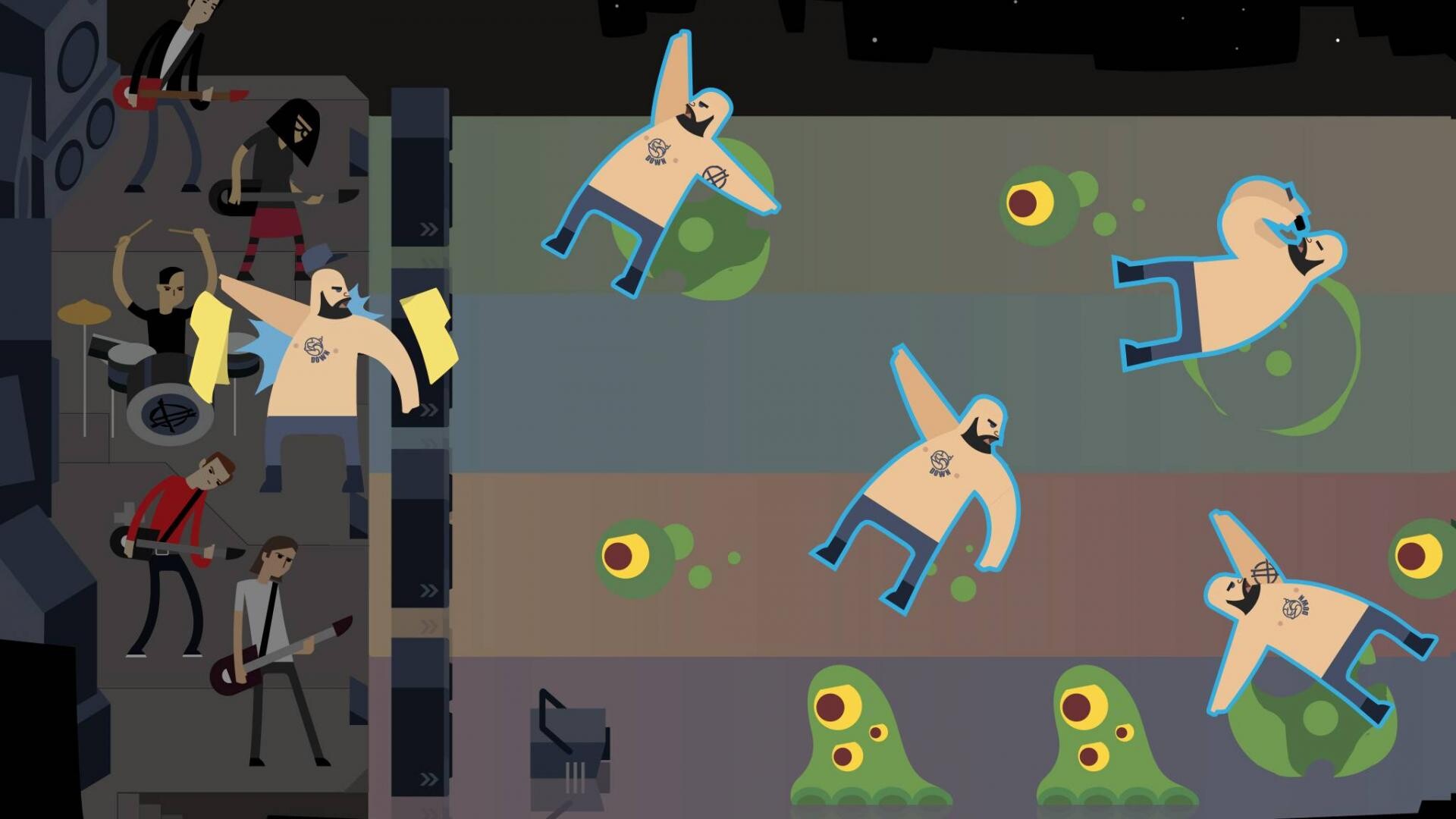 The horde is comprised of several types of unique aliens that all share one thing in common: They hate being blasted in the face with sweet, sweet music. Some of them speed up once they’ve been hit, some explode green goop all over the screen to block vision and some split into smaller, faster aliens once defeated. Each alien takes a different number of blasts to destroy, indicated by the number of eyes on their body.