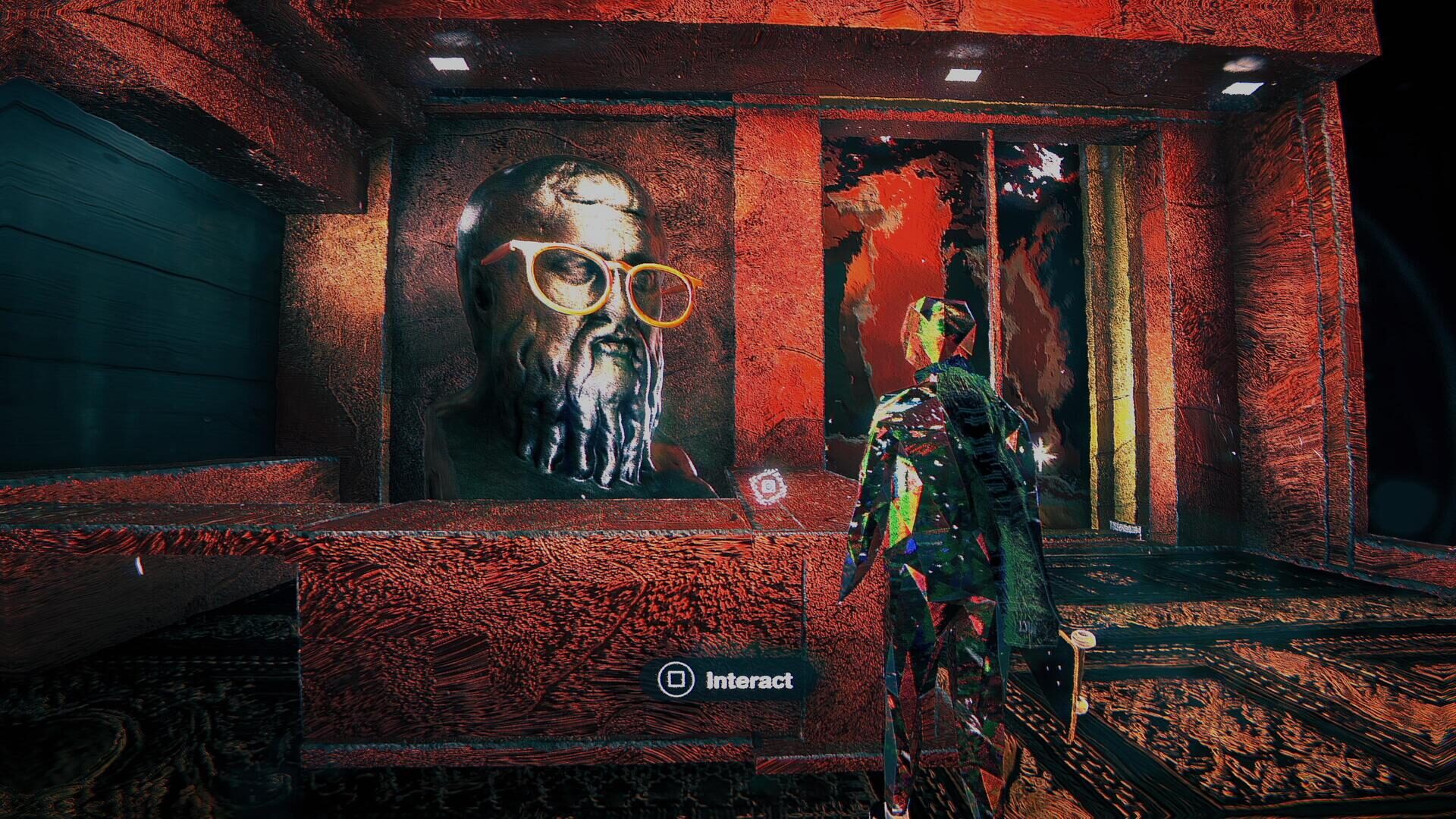 Every time you do a trick in Skate Story, you earn soul, which can be used to purchase additional boards, wheels, and other cosmetics like stickers, which can also be found strewn about the map. There is a certain deliberate pretentiousness to Skate Story’s narrative and overall vibe, such as the philosopher’s bust that you must wow and a café-bound pigeon suffering from writer’s block. Instead of feeling forced or cringeworthy, everything in Skate Story just comes off as charming, or even cool, particularly one section towards the end of the game.
