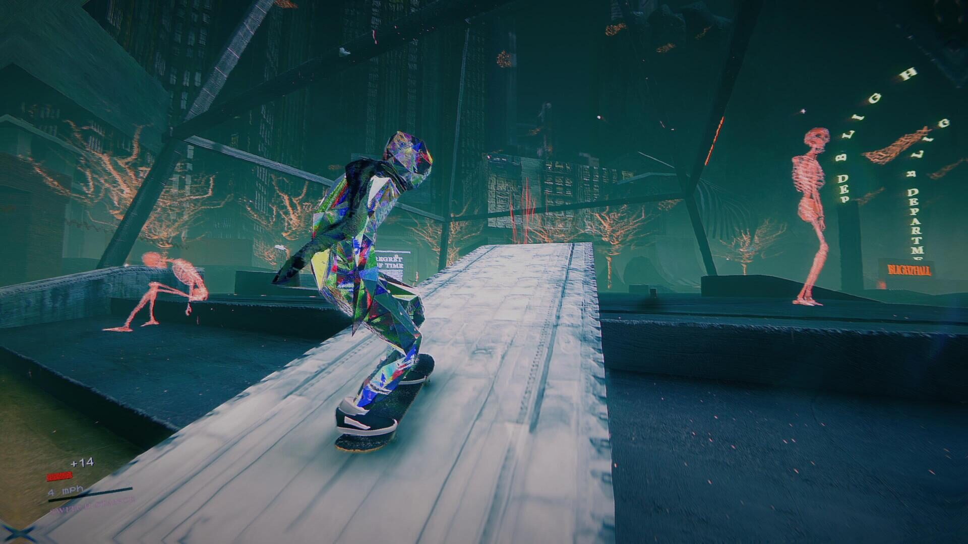 Skate Story’s aesthetic is a masterful blend of abstract vaporwave art, reminiscent of games like Rez, tinged with distinct 4th wall-breaking undertones of Neon Genesis Evangelion. Instead of being bound by flesh and blood, you, as the player in Skate Story, are of an ethereal crystalline substance, free to skate with reckless abandon, as your soul is bound to the devil, bringing you back again and again, no matter how brilliantly you shatter yourself into diamond dust against the pavement.