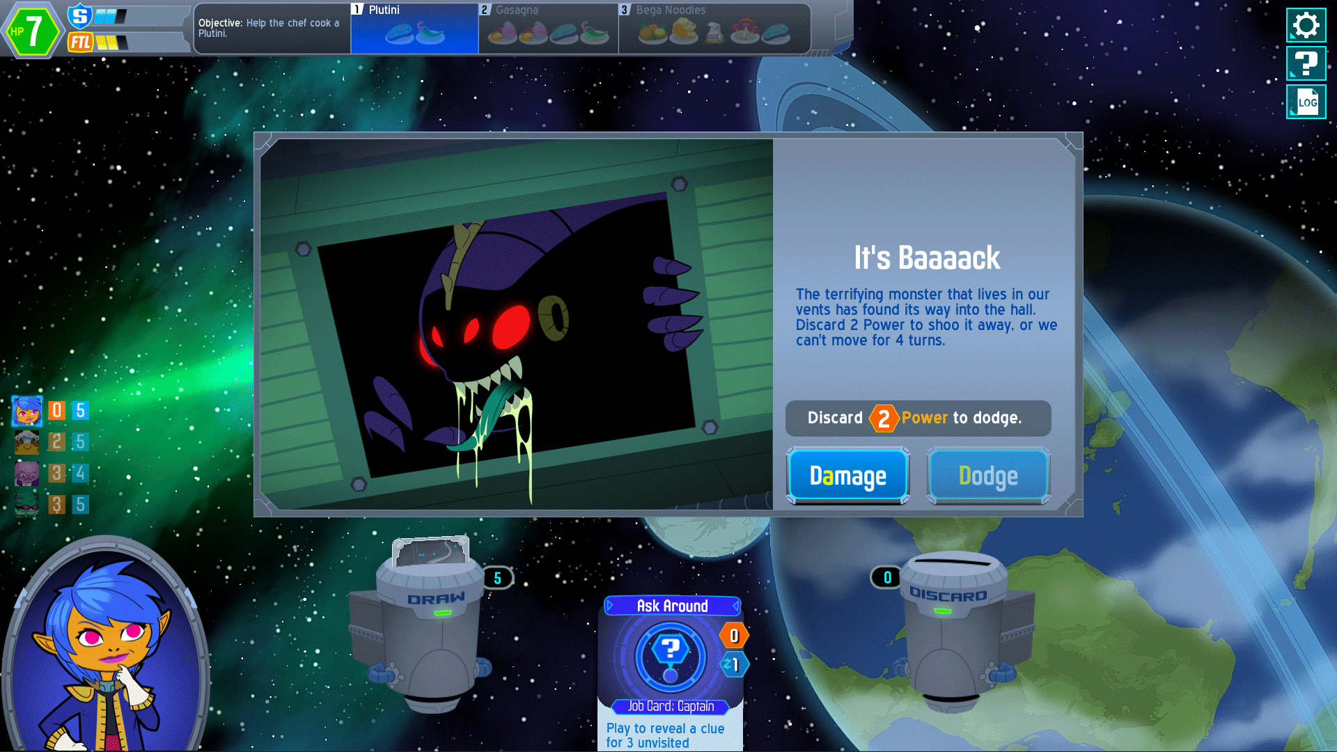 Gameplay is just as interesting in Space Food Truck. Initially I had thought SFT would play like FTL, mixing RTS with RPG elements. However, STF is actually a strategic card game with little Oregon Trail events peppered in before each turn. Each member of the crew draws different cards unique to their abilities. Players then try to stack “throwaway” cards in order to boost the effects of specific action cards. The Captain may draw an “Engage” card, allowing the player to travel to distant planets. Depending on how many cards they stack, adding power to their main card determine how many planets they can visit.