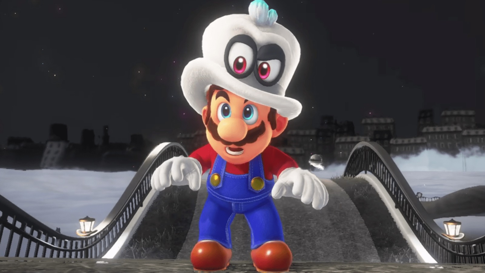 So plot—well, this is going to really surprise you—the game starts with Bowser kidnapping Princess Peach and taking her away on a flying battleship. I know, so different, right? Well, this time Bowser has a matching white wedding suit and dress for himself and Peach. From there, Mario ends up in Cap Kingdom, Bonnetown. It’s a place with sentient flying hats, and Mario quickly befriends one. He replaces Mario’s classic hat, and allows Mario to move his hat around to attack enemies, jump off of his hat, and use his hat to pick up objects from the ground to further attack them.