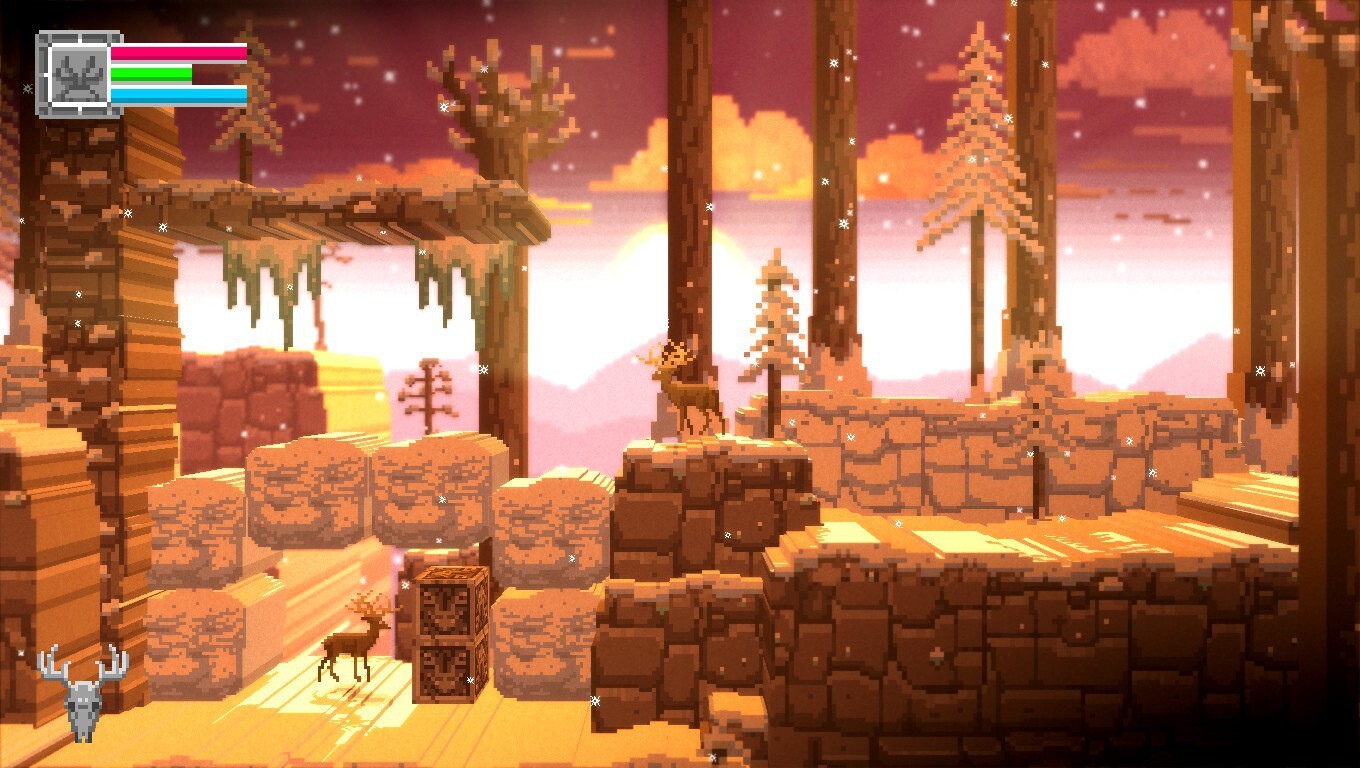 The animals and humans are all two-dimensional pixels; rabbits, cows, wolves, bears, hunters, and even ghosts and skeletons populate these sprawling wilds. Most of them wanted to kill me, with foxes and porcupines being the first encounters that tried to end the spotted fawn I had become. Fortunately, your deer is not helpless against such attacks—you can leap and run away from most enemies and you can headbutt foes to death, causing them to dissolve into gleaming streams of lights heading for the heavens. You gain the ability to double-jump nearly right out of the gate, allowing you to run from your opponents, should you be overwhelmed by jungle cats.