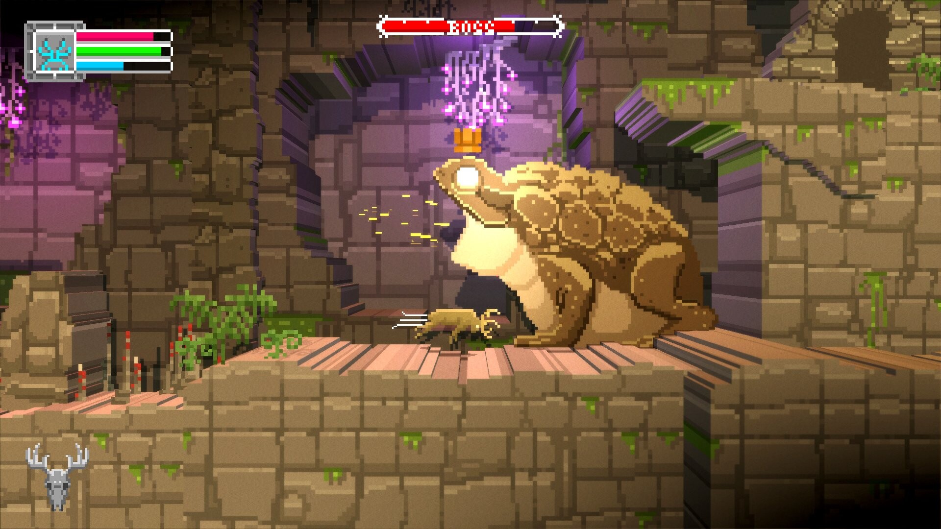 The entire game being 2D, your only real direction is to go is right. Areas are randomized, with event areas appearing in linear order—passing them by only means they’re reappear a few geographical regions later. Occasionally, you can find a boss area, presenting you with a bit more challenge as you try to figure out the boss’ gimmick—a gigantic snake, which I fought several times, required I keep my mind on its lair and the structures within. These fights can kill you, costing you a few deer’s skulls, though you’ll get at least one in the fountain of items they drop when they die. Most bosses are, unfortunately, optional—only two are required, and both of these are quite straightforward. Over time, the areas become repetitive and after a while, you can recognize the various ‘blocks’ of world, down to cliff structure and pits—which becomes more egregious when you start to actually see the same two pits multiple times one after another, sapping the desire to explore to find something new.