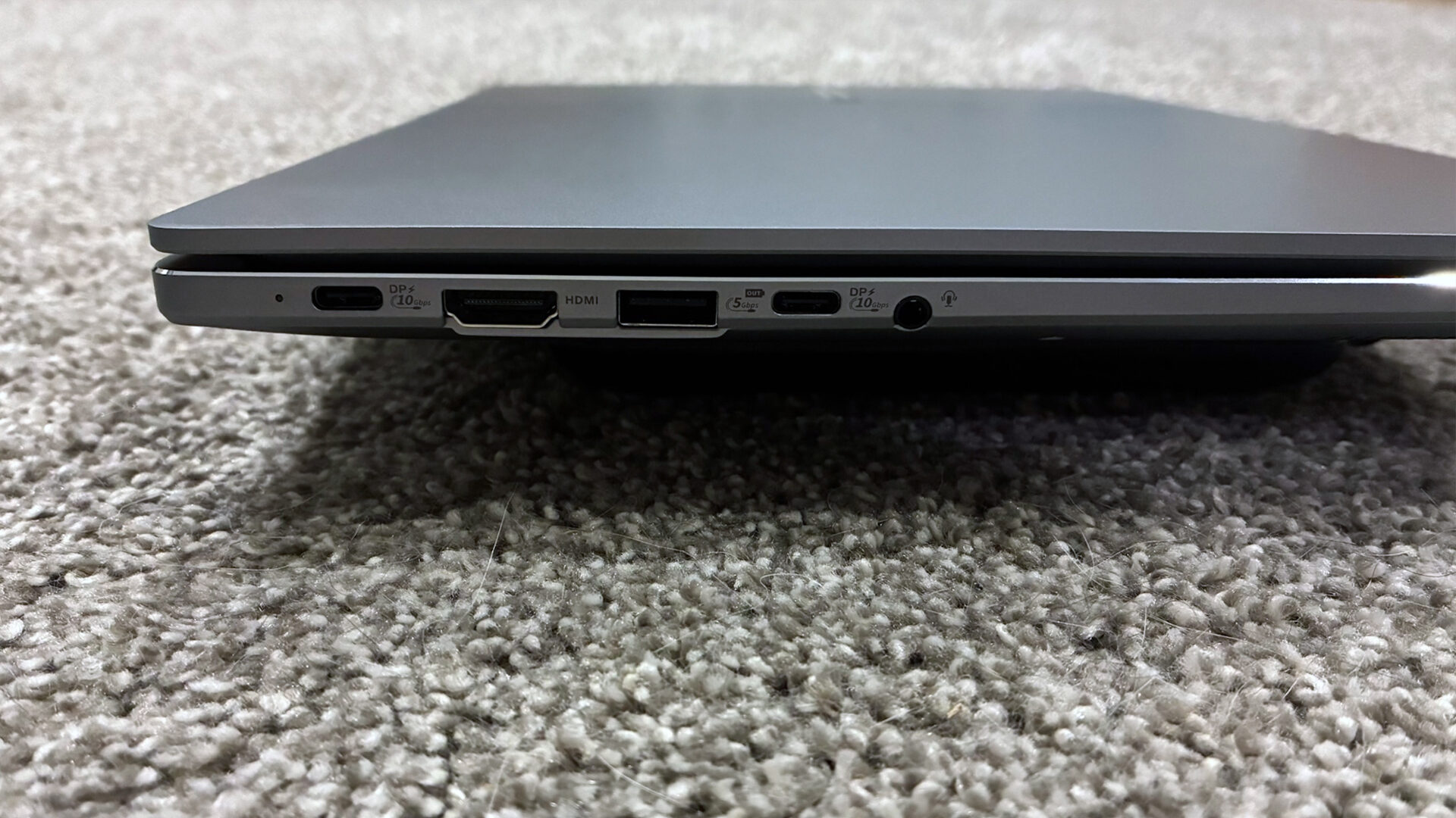 As is my usual approach, I will begin by examining the laptop’s overall port selection. On the left side, the laptop includes a full-function USB 3.2 Gen 2 Type-C port, an HDMI 2.1 port, a USB 3.2 Gen 1 Type-A port, a second full-function USB 3.2 Gen 2 Type-C port and a combined headphone and microphone jack. Both Type-C ports support charging, data transfer and display output.