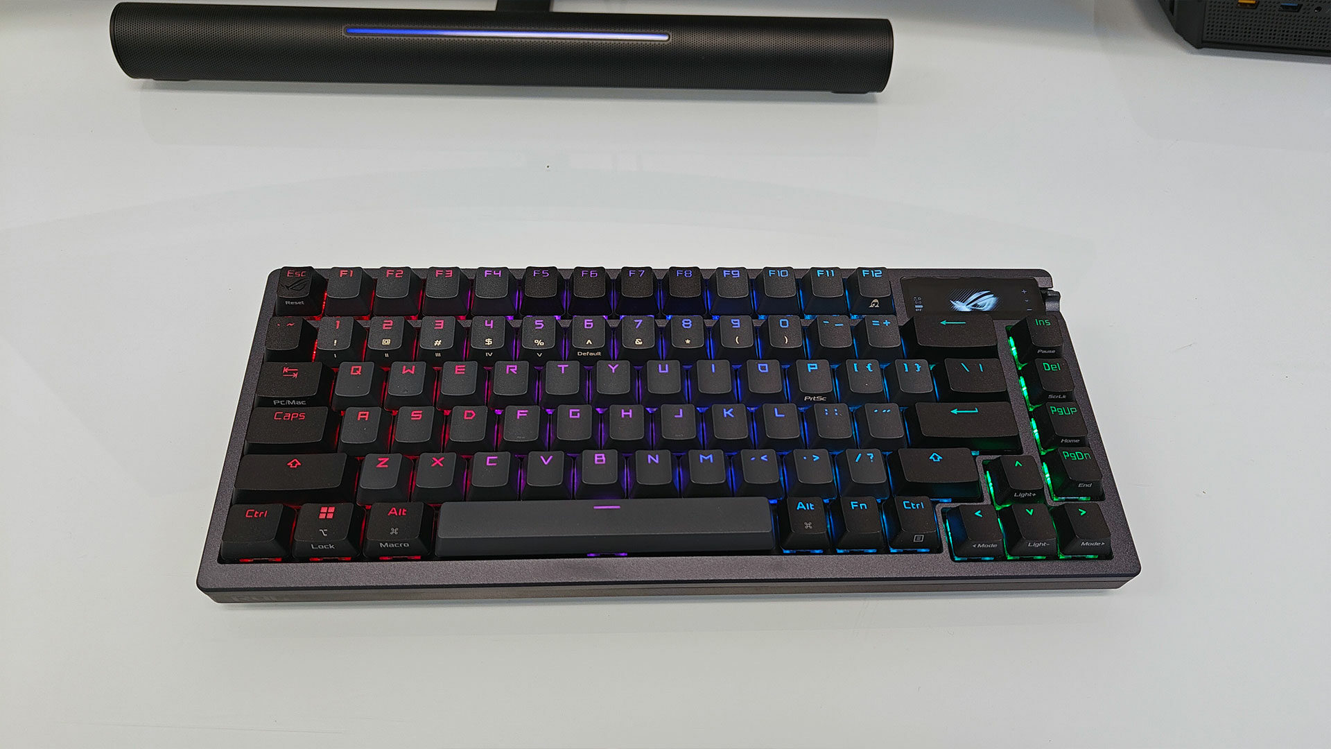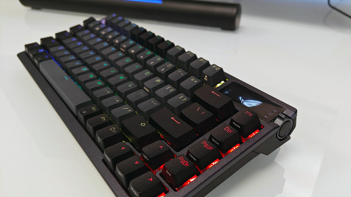 Aside from the weight and build quality, there are a few other things that set the ROG Azoth apart from other options on the market. These include the OLED screen, which is accompanied by a multi-function wheel on the right-hand side, the PBT Doubleshot keycaps and some subtle but pleasant RGB lighting that complements the dark grey look that ASUS has chosen for this keyboard.