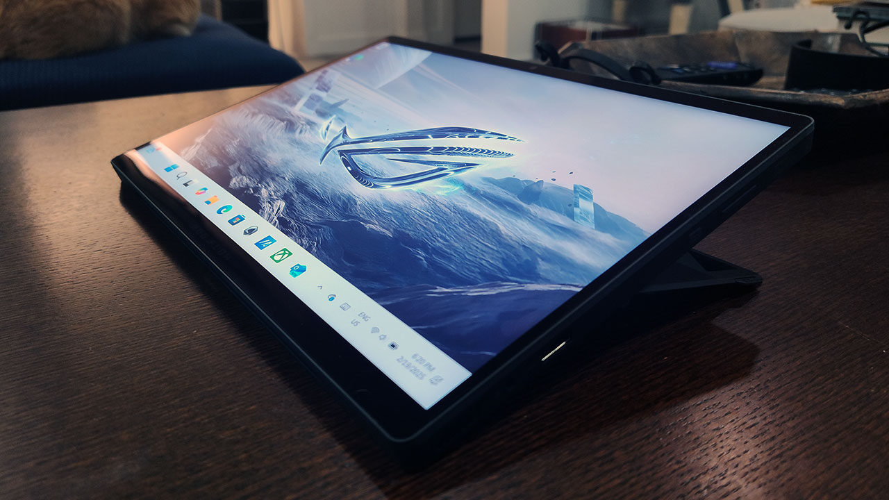 The Asus ROG Flow Z13 comes with a keyboard attached, and together, they initially surprised me with their weight of 2.65 lb.—0.7 lb. more than a Microsoft Surface Pro 9 tablet and more than double that of a 13-inch iPad Pro, although 0.4 lb. lighter than the HP EliteBook I previously reviewed. I found it felt heavier than it actually was, though that could be due to the weight being condensed into a smaller package. This added weight over a more conventional tablet could be a potential issue for those looking to hold the device in their hands for extended periods, as it will likely lead to arm fatigue.