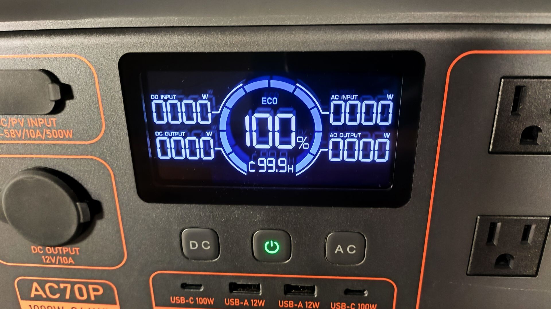 A carry handle is built into the top panel, moulded seamlessly into the shell to double as a hand grip. It feels rugged, and at a weight of 22.5 lbs, it’s sturdy yet light enough not to feel burdensome. The AC70P measures 10″ H x 8.2″ W x 12.4″ L, making it fairly compact considering the battery size (more on this in a moment). Every port and indicator is clearly labelled, making it easy to navigate the display and buttons.
