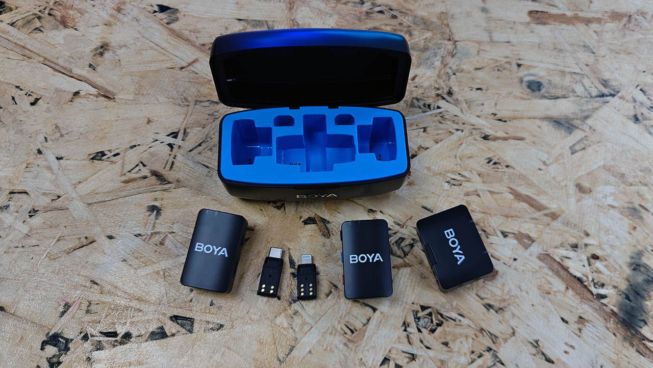 In the box, the BoyaMic comes with a charging case, a receiver, two transmitters, windscreens for the transmitters, two wired lavalier microphones (which hook up to the transmitters) with windscreens, magnets that connect to the transmitters’ clips, receiver connections for both USB-C and Lightning, a 3.5-mm TRS to TRS cable, a USB-A to USB-C cable, and a carrying pouch for all of those accessories.