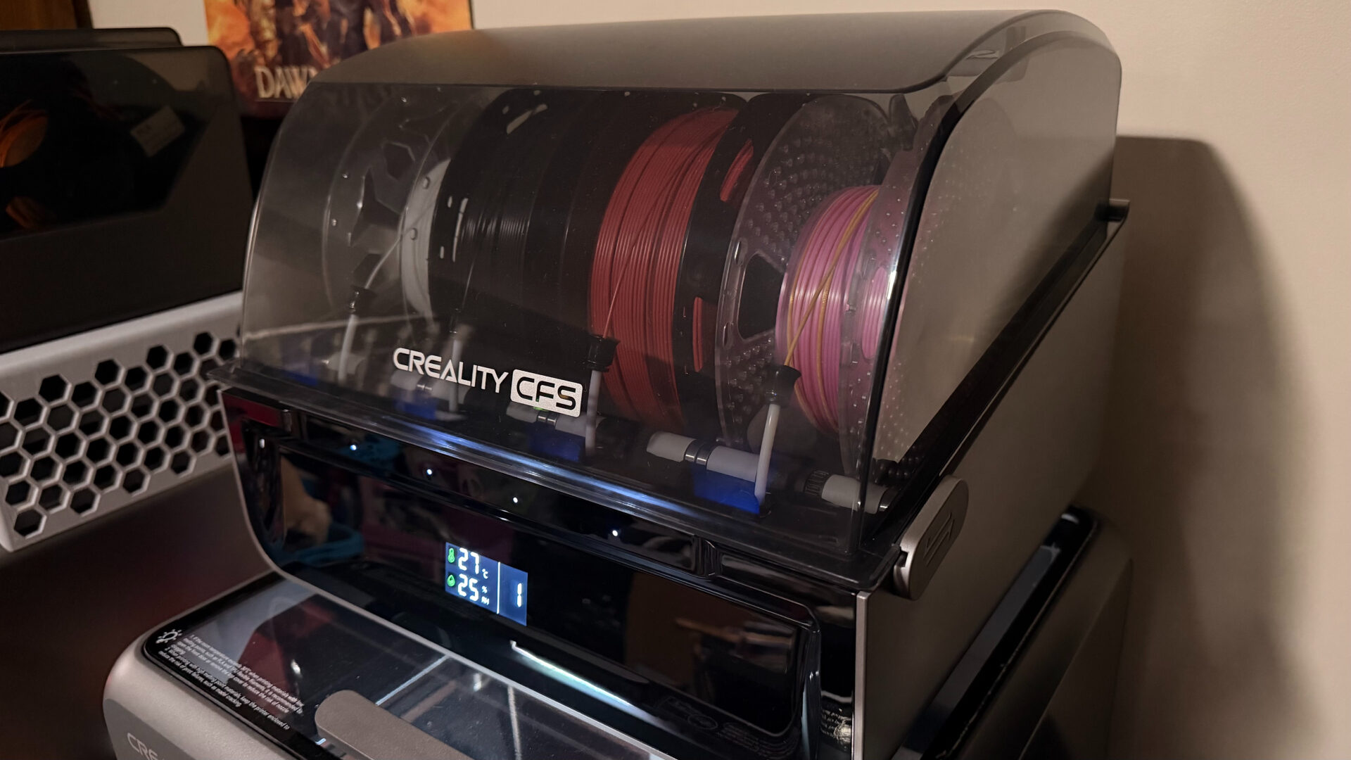The Creality Filament System (CFS) allows the Creality K2 to access up to 4 spools of filament at a time (or 5 if you include the exterior filament spool). This means you can print a single model with multiple colours if you so choose, or simply keep four different colours on tap at any given time. As I found with Anycubic’s competition last year, multicoloured prints are nice as an option but a headache in practice; it’s not a fault against the machine itself, it’s just a time-consuming process, especially if it’s a complex design with intricately interwoven hues. Each colour on each layer requires a separate pause, flush, and reheating process, slowing down a job and increasing waste exponentially.