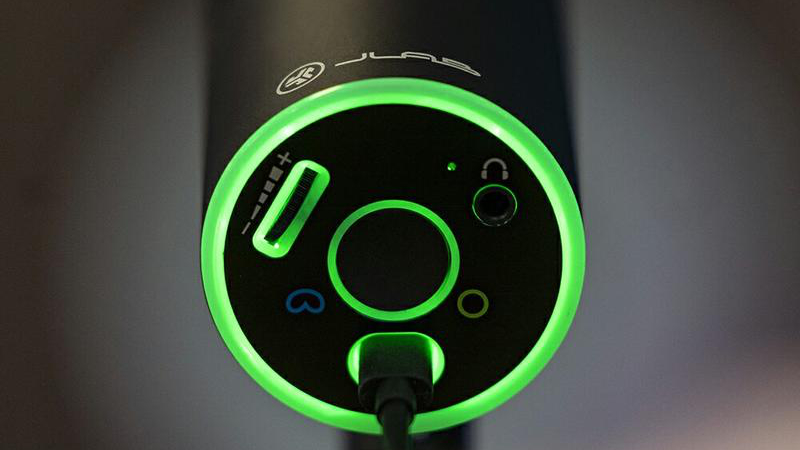 Also, at the bottom is a single button with a lot of control. In addition to being the mute button on the mic, holding it down allows you to switch between its two available polar patterns (Cardioid and Omnidirectional). The indicator of which polar pattern it is shows up as a colour on an LED ring at the bottom of the mic (Green or blue… or red when muted). Also worth noting is that you can actually see the lights on this microphone, unlike the Talk Pro.