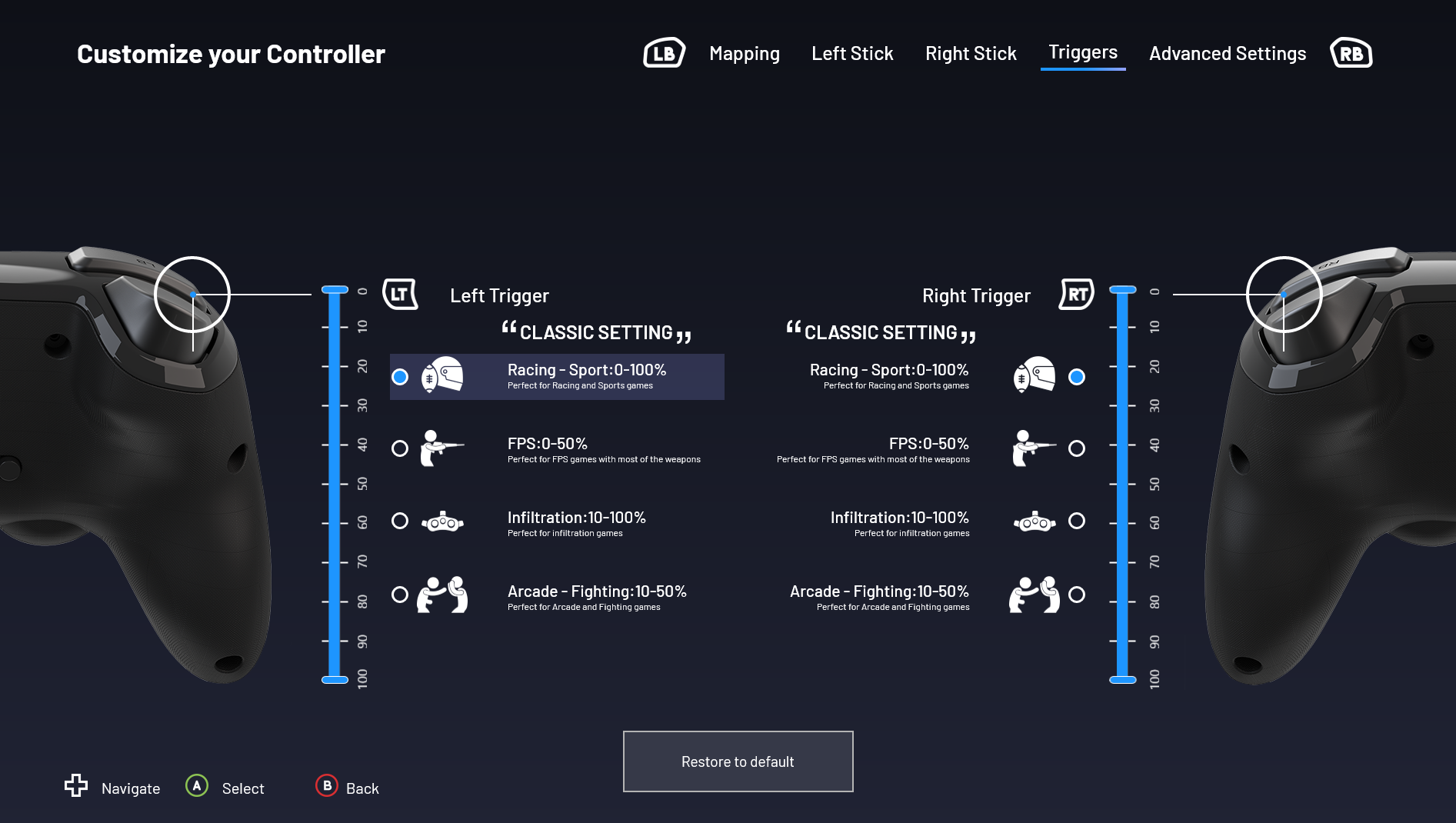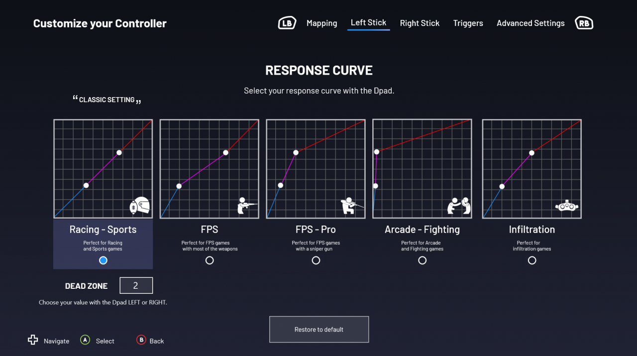 On the back you’ll find a switch that allows players to switch between your standard profile (classic mode) and custom profile (advanced mode). With the Pro Compact app for Microsoft each button can be customized to suit your needs. You can control the response curve of each stick and the dead zone of each trigger by choosing between Racing-Sports, FPS, FPS-Pro, Arcade-Fighting and Infiltration. Here you can also turn vibration on or off, invert your sticks, or convert your Dpad from 8-way to 4-way. With a flick of the switch on the back you can move between your standard and custom profiles with ease depending on the needs of the player or game.