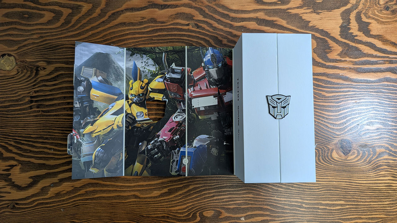 The accessories (charging block, USB cable, and earbuds) are all white without any Transformers branding. The outer box unfolds into a small poster with an Autobot-shaped cutout. While making the inner box resemble Prime’s trailer would have been a nice touch, the packaging was still well-executed.