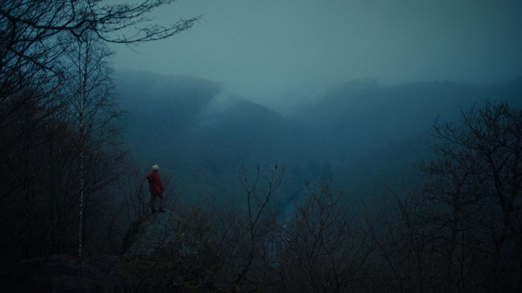 Eve (Lucie Debay) is a stressed-out working woman with a frustrating boss. On a business trip, after the relatable experience of work-related strain, she decides to take herself out for a cocktail. On her excursion, she’s approached by the typical relentless bar star, a man unwilling to take no for an answer. But soon, she meets a white knight, an unnamed man (Arieh Worthalter) who shoos the other away and brings fun to her dwindling evening. But this man, like the one before him, also doesn’t like being told what he can and can’t do. After inviting her to his car to make out, he locks Eve in with his accomplice (Ciaran O’Brien) and takes her on a ride. After some attempted escapes and moments that feel like she might have a shot, Eve is back on route to her supposed demise. A car accident gives her the opportunity to flea into the woods, setting off a hunt, the two men trying to get the woman in a red raincoat. Then it turns into a deranged tale of a woman refusing to be prey that bleeds from every orifice.