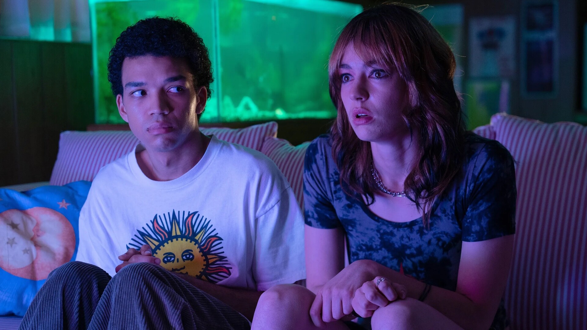 Owen became immediately intrigued when wandering through the school halls to find a lone Maddy reading a classic TV guide on a fictional teen show called “The Pink Opaque.” Owen becomes intrinsically fascinated with the show because its taboo airtime is right past his bedtime. As he grew up, Justice Smith (Dungeons & Dragons: Honor Among Thieves, The Quarry) took up the mantle of a high school and adult Owen—as he grappled with understanding the show on a deeper level throughout his life.