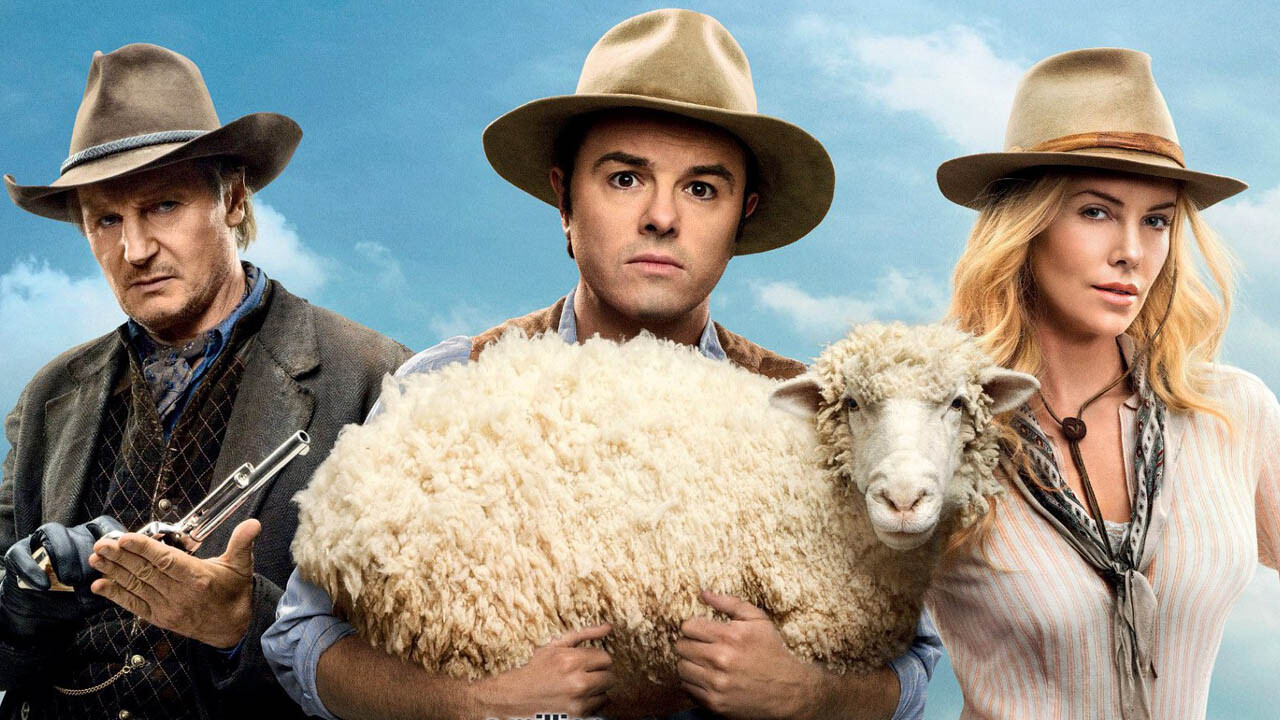 The film opens with some genuinely stunning shots of Monument Valley, the place John Ford and countless other classic Western directors made iconic decades ago. For a moment it feels like MacFarlane might have a genuine affinity for the genre and desire to dabble in homage, but that goes away pretty much instantly. He’s using the Western just as a clothes line to hang jokes onto and thankfully he’s pretty good at that. The plot is standard Western fare, just structure for a punch up session by MacFarlane, his Ted writing collaborators (Alec Sulkin and Wellesley Wild), and presumably a vast swab of the Family Guy and American Dad writing staff. MacFarlane stars as a lowly sheep farmer who is hated by his community for being a chicken and freshly dumped by his girlfriend (Amanda Seyfried) for similar reasons. He starts the movie on a low purely so that he can rise up through the most basic of hero’s journey plot devices. It all hinges on Charlize Theron, a wise cracking dame who has a way with a gun and for some reason decides to teach MacFarlane how to be a hero, love himself, and fall in love with a delightful gal like herself. She also has an evil cowboy husband played by Liam Neeson, so there’s a villain built right into the A plot. Then around the edges there’s a subplot involving a virgin Giovanni Ribisi and his hooker girlfriend Sarah Silverman, a second villain in a mustache -sporting Neil Patrick Harris as Seyfried’s new beau, and numerous cameos from MacFarlane’s famous friends like Bill Maher, Ryan Reynolds, Ralph Garman, and, oddly, Ewan McGregor.
