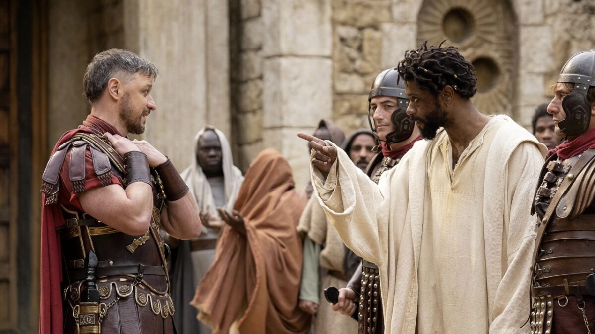Set in Jerusalem 33 A.D., we’re introduced to the titular Clarence (Lakeith Stanfield): a petty criminal, atheist and twin brother to Jesus’ apostle Thomas (also played by Stanfield) who finds himself in a major predicament. After losing a chariot race to Mary Magdalene (Teyana Taylor) in the opening scene, he finds himself in major debt to Jedediah The Terrible (Eric Kofi-Abrefa), a loan shark whose sister Varinia (Anna Diop) Clarence happens to be infatuated with.