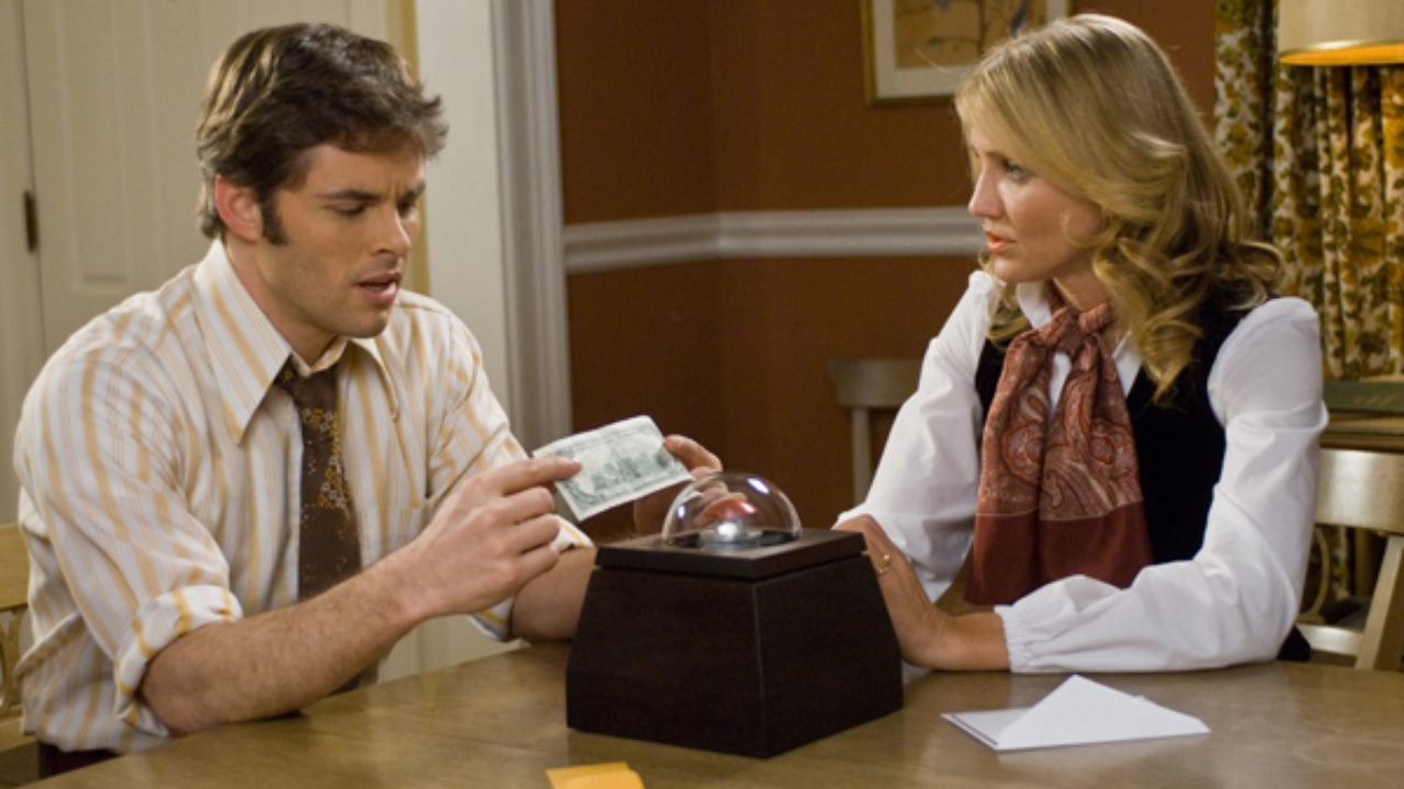 The tile of the film comes from a perfectly innocuous package that arrives on the doorstep of Arthur and Norma Lewis (James Marsden and Cameron Diaz). Inside the box is a wood-mounted button covered by a locked glass dome and a note that says Mr. Steward will be by at 5 pm to explain what the deal is. The deal is you press the button and collect a cool million, tax free. Of course, pushing the button will kill some random person on the Earth somewhere, but you don’t know them. Or you can always not push the button, not get a million dollars and forget the whole thing as the deal goes to someone else to ponder. Either way, you’ve got the day to decide.