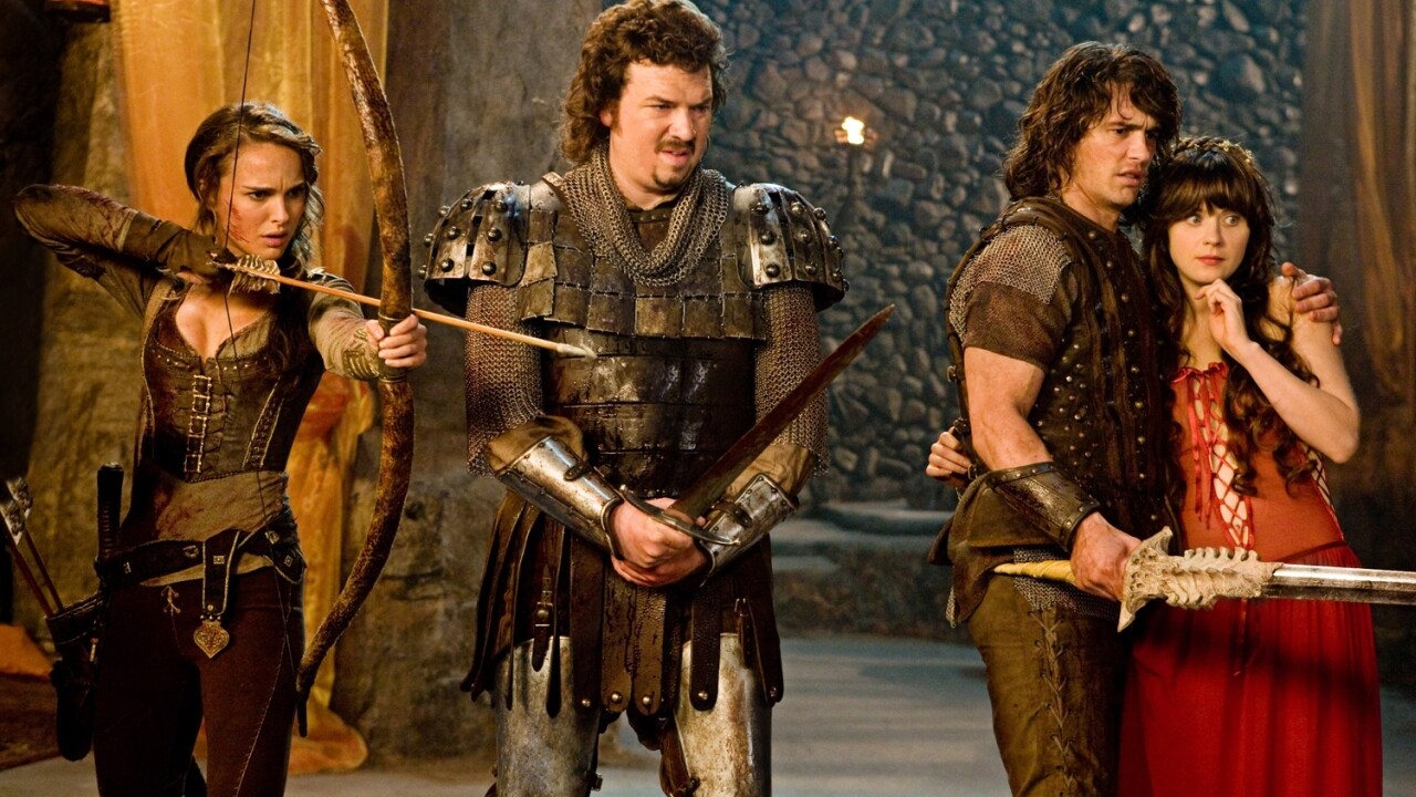 Your Highness stars Danny McBride as Thadeous, a ne’er-do-well prince whose life dedicated to booze, weed, n’ boobs has always been over shadowed by his brother Fabious’ endless series of heroic quests. James Franco plays Fabious as a clueless hero who rescues a virgin (the preposterously beautiful Zooey Deschanel, also an All The Real Girls veteran) only to have her kidnapped at their wedding by an evil wizard played by Justin Theroux (Mulholland Drive). The brothers then set out on a quest to rescue her, encountering the expected collection of bizarre characters including a puppet who has possibly molested Franco since childhood and a bizarre man-baby who leads a tribe of topless ladies and controls a giant five headed serpent with his hand. Along the way they also meet up with Natalie Portman’s female warrior to give McBride a love interest and yadda yadda yadda, good triumphs over evil.